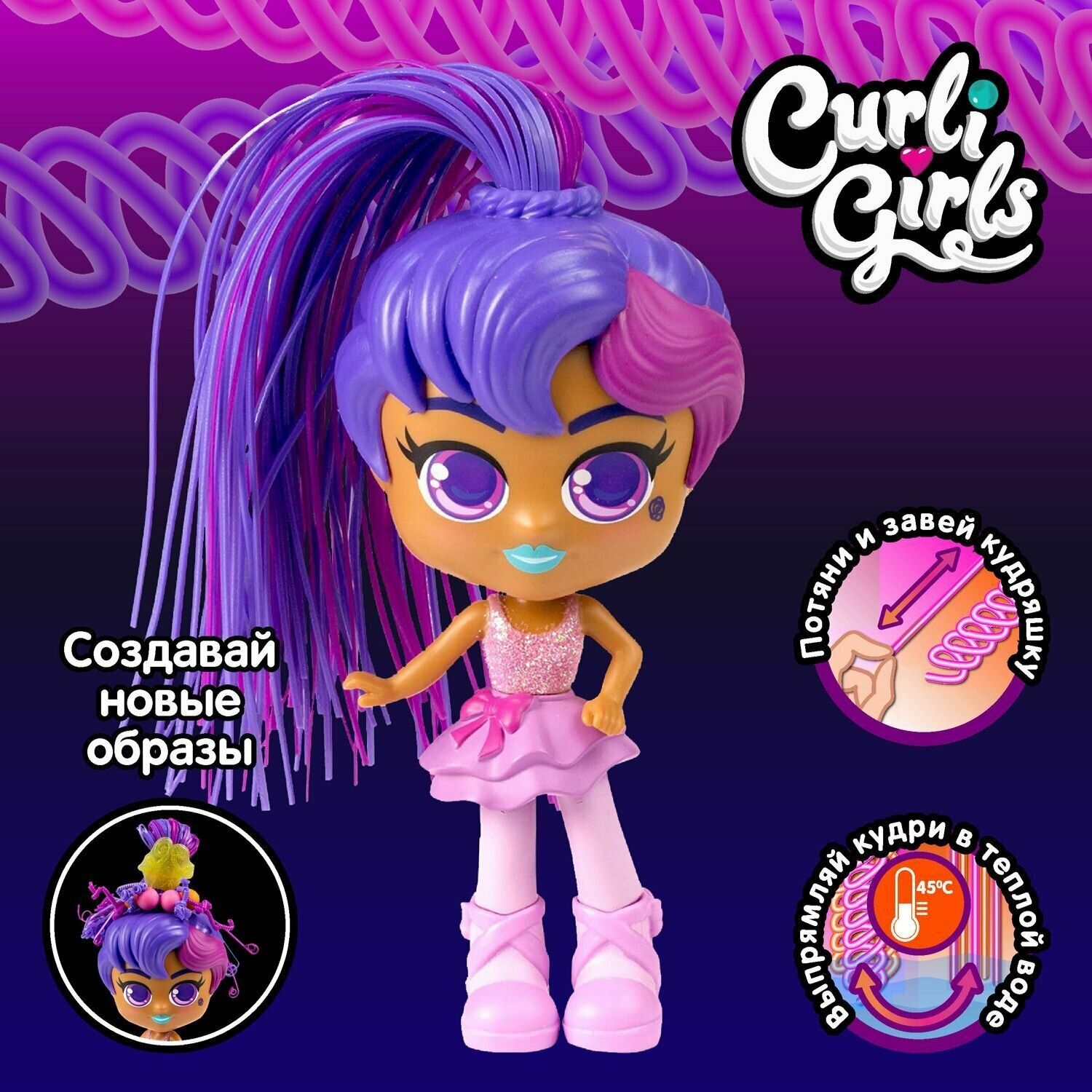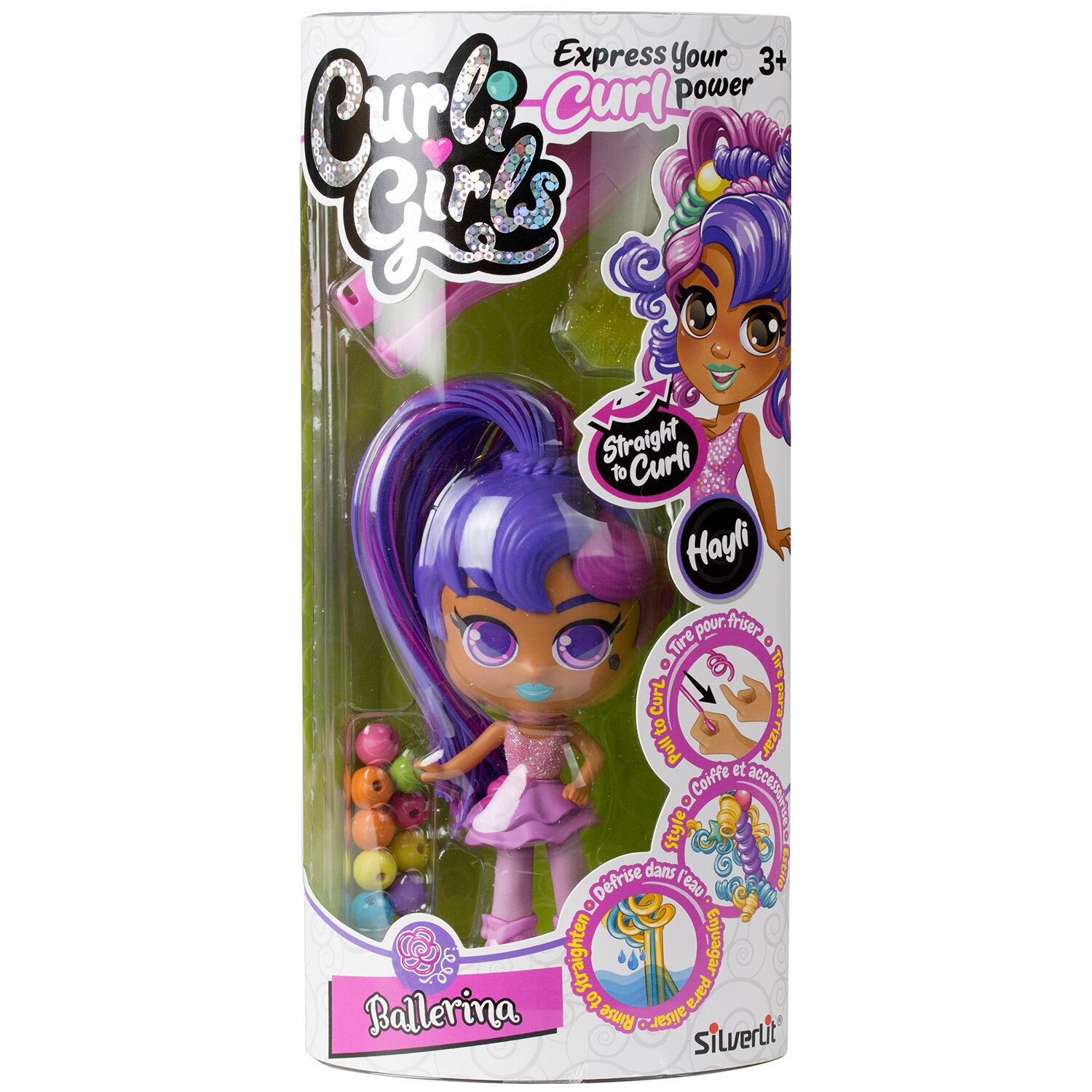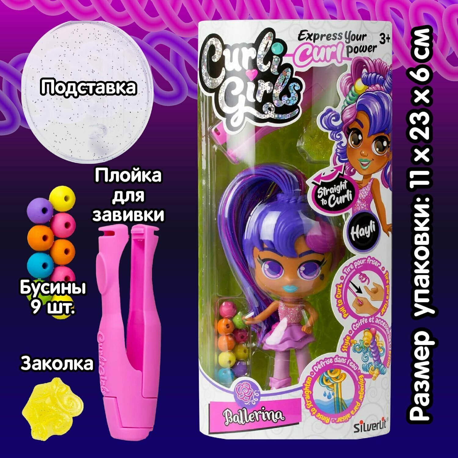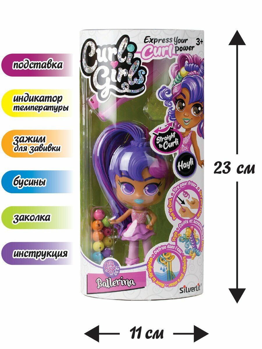 Curli Girls Кукла Балерина Хейли - коллекционная история кукол для девочек от 3-х до 10 лет. КЁРЛИ ГЁРЛС - это девчонки-подружки, которые обожают делать различные стильные и интересные прически, используя силу своих кудряшек. Потяни за локон, завей кудряшку, используй различные аксессуары - заколки, резинки, бусинки, спиральки, придумывай все новые и новые образы. Можно создавать уникальные и неповторимые прически: сделай Чарли крупные локоны, а Хейли мелкие кудряшки, Келли любит высокие хвостики, а Бейли озорные косички! Придумай образ для каждой из подружек, а потом просто прополощи волосы в тёплой воде, и произойдёт чудо - они снова выпрямятся для создания новых волшебных и необычных причёсок. Ощути силу кудряшек с КЁРЛИ ГЁРЛС!Поп-звезда Чарли обожает петь! Создай для нее уникальную прическу для выступления на концерте. В набор входит: кукла – 1 шт., зажим для завивки – 1 шт., индикатор температуры – 1 шт., бусинки – 9 шт., заколка – 1 шт., подставка для куклы – 1 шт., инструкция – 1 шт.