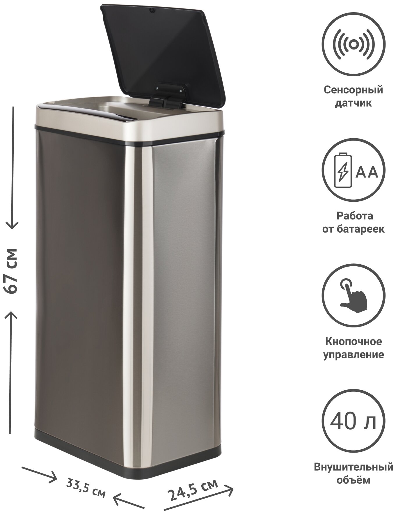 Сенсорное мусорное ведро Tesler STB-40 - простое и технологичное решение утилизации бытовых и пищевых отходов. Материал контейнера - плотная нержавеющая сталь высокого качества. Материал автоматической крышки - приятный на ощупь плотный и прочный пластик черного цвета. Несколько режимов работы, в том числе ручной, который позволяет управлять открытием и закрытием крышки контейнера с помощью сенсорных кнопок, расположенных на фронтальной панели сенсорного ведра. Отличительной особенностью таких урн является наличие сенсорного датчика, который самостоятельно открывает крышку мусоросборника при приближении пользователя к ней на расстояние 10-15см Теперь не нужно прикасаться к ведру, чтобы выкинуть мусор, и ваши руки останутся чистыми. Вы можете забыть о необходимости закрывать крышку - через 5 секунд она сама автоматически закроется. Простая прямоугольная форма удачно впишется в любой интерьер. Питание от 4-х батареек АА, это позволяет разместить ведро автономно вне зоны доступа электрической сети. Размер контейнера: 33x24x65 см. Цвет: контейнера - серебристый/черный, крышки - черный. Вес: 3 кг.