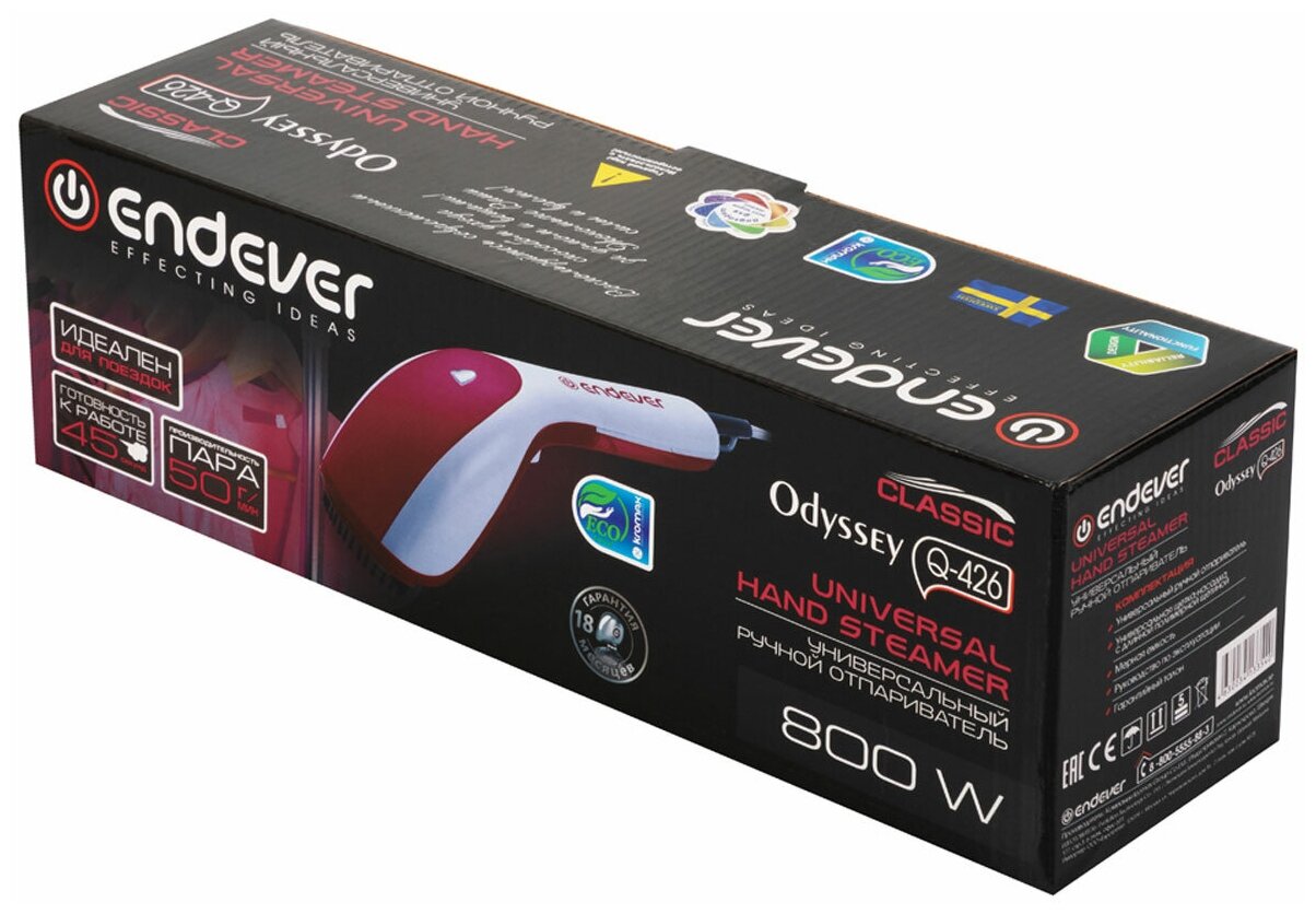 | Прочие особенности и свойства | Не смотря на свою компактность, отпариватель Endever Odyssey Q-426 обладает высокой мощностью 800 Вт, которая позволяет обеспечить постоянную подачу пара – 50 г/мин – для достижения идеального результата на любых типах ткани.,Для удобного глажения одежды больше не нужны громоздкие доски, ведь Q-426 с легкостью отпаривают одежду как в горизонтальном, так и в вертикальном положении. Ухаживать за легким и воздушным платьем из шифона, не снимания его с вешалки, а также разглаживать трудные участки одежды, такие, как воротнички и манжеты - теперь все это можно сделать с помощью ручного отпаривателя Q-426, легких и портативных. В отличие от традиционного утюга, отпариватель Q-426 не даст ткани растянуться, прибавив ей объема и эластичности.,Благодаря специальной продолговатой форме подошвы, а также функциональному расположению паровых отверстий, отпаривание изделий сложного кроя больше не проблема.,Endever Odyssey Q-426 достигает оптимальной температуры работы всего за 45 секунд, а благодаря интуитивно понятному управлению, Вам остается только нажать кнопку подачи пара на ручке устройства.,Визуально контролировать уровень воды в процессе работы позволяет прозрачный дизайн резервуара, объем которого составляет 50 мл. Для удобства заполнения резервуара в комплект входит мерная емкость-стаканчик.,Модель комплектуется удобной насадкой-щеткой, предназначенной для удаления загрязнений и ворсинок.,Endever Odyssey Q-426 компактный и портативный, он с легкостью поместятся в любой чемодан и найдет применение как в домашних условиях, так и в путешествии. А удобная петелька для подвешивания станет приятным бонусом, облегчающим хранение устройства. |