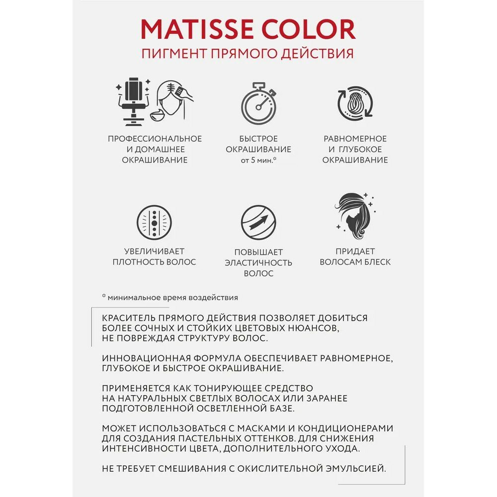 Пигмент прямого действия придает волосам яркий насыщенный цвет и искристое сияние. Не требует использования окислителя, не повреждает локоны, обеспечивает быстрое и равномерное нанесение. Восстанавливает поврежденные участки волос, делая их сильными, гибкими, эластичными и плотными. На светлых оттенках пигмент может использоваться как тонирующее средство.