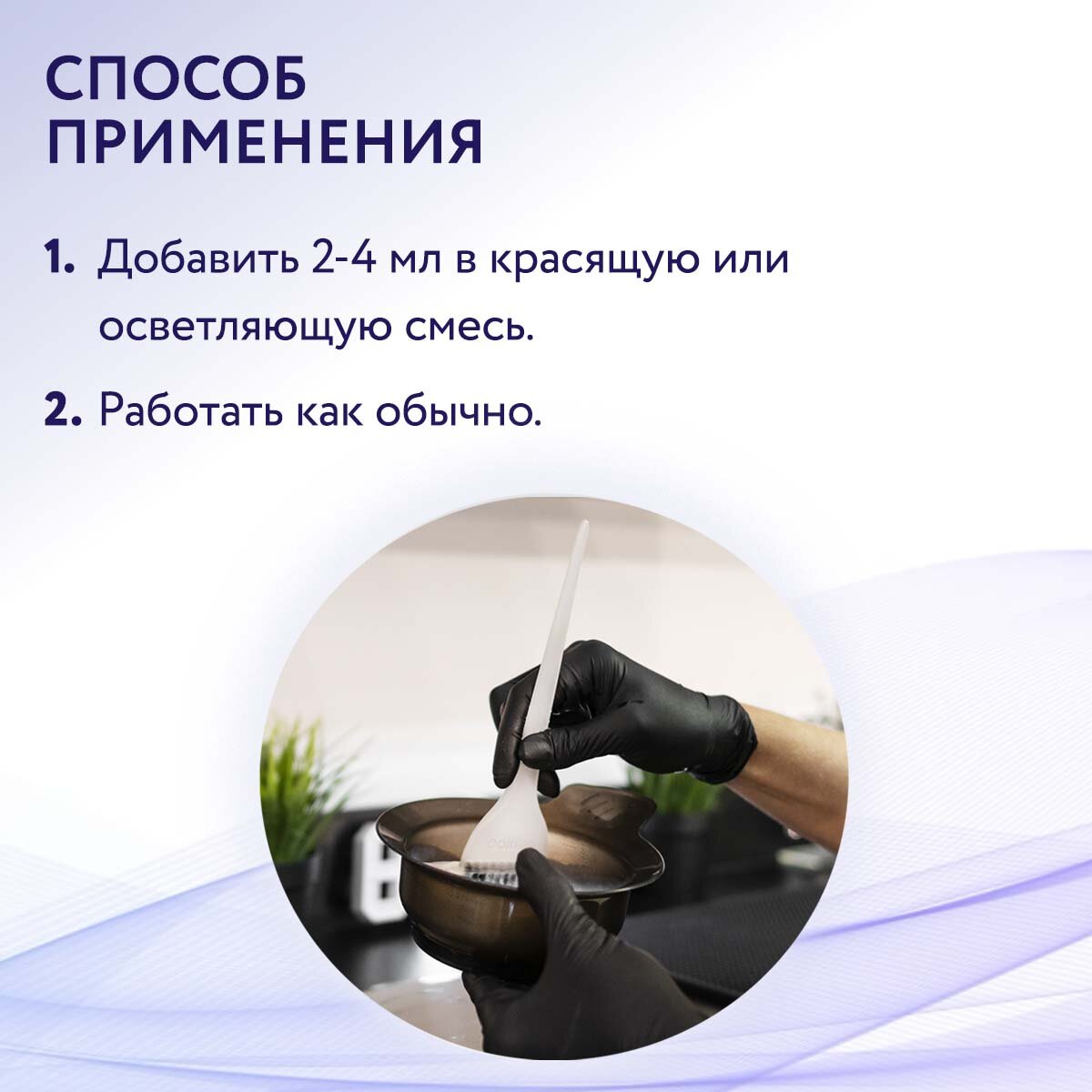 Способ применения: добавить 2-4 мл в красящую или осветляющую смесь, и работайте как обычно.