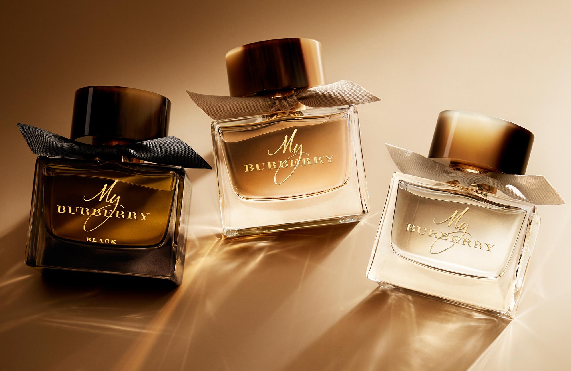 Флакон насыщенного янтарного оттенка с темной роговой крышкой, напоминающей пуговицы тренча Burberry, украшен завязанным вручную бантом из черного габардина.
