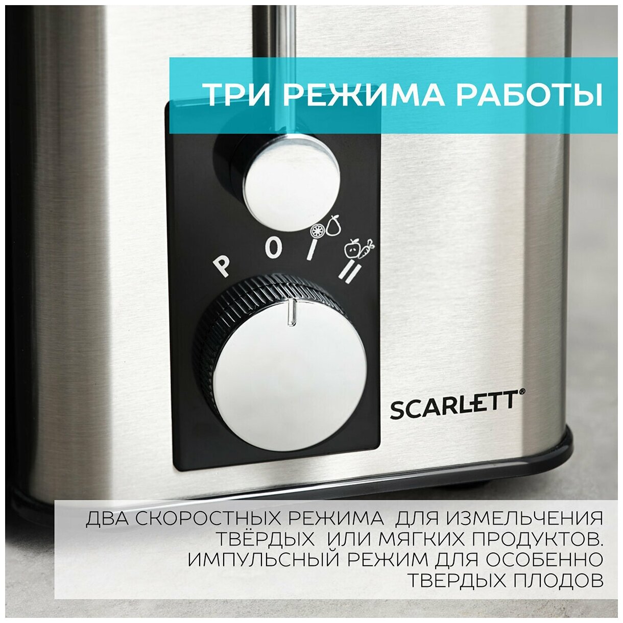 Соковыжималка Scarlett снабжена мощным мотором, выдерживающим долгую непрерывную работу. Она предлагает два режима, подходящие для измельчения твёрдых или мягких продуктов – в том числе апельсинов, манго, моркови, яблок и многого другого.
