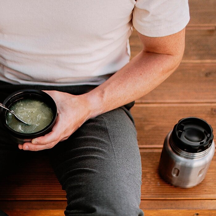 Термос для еды с удобным широким горлом и со встроенной складной ложкой. Надолго сохранит температуру ваших любимых блюд