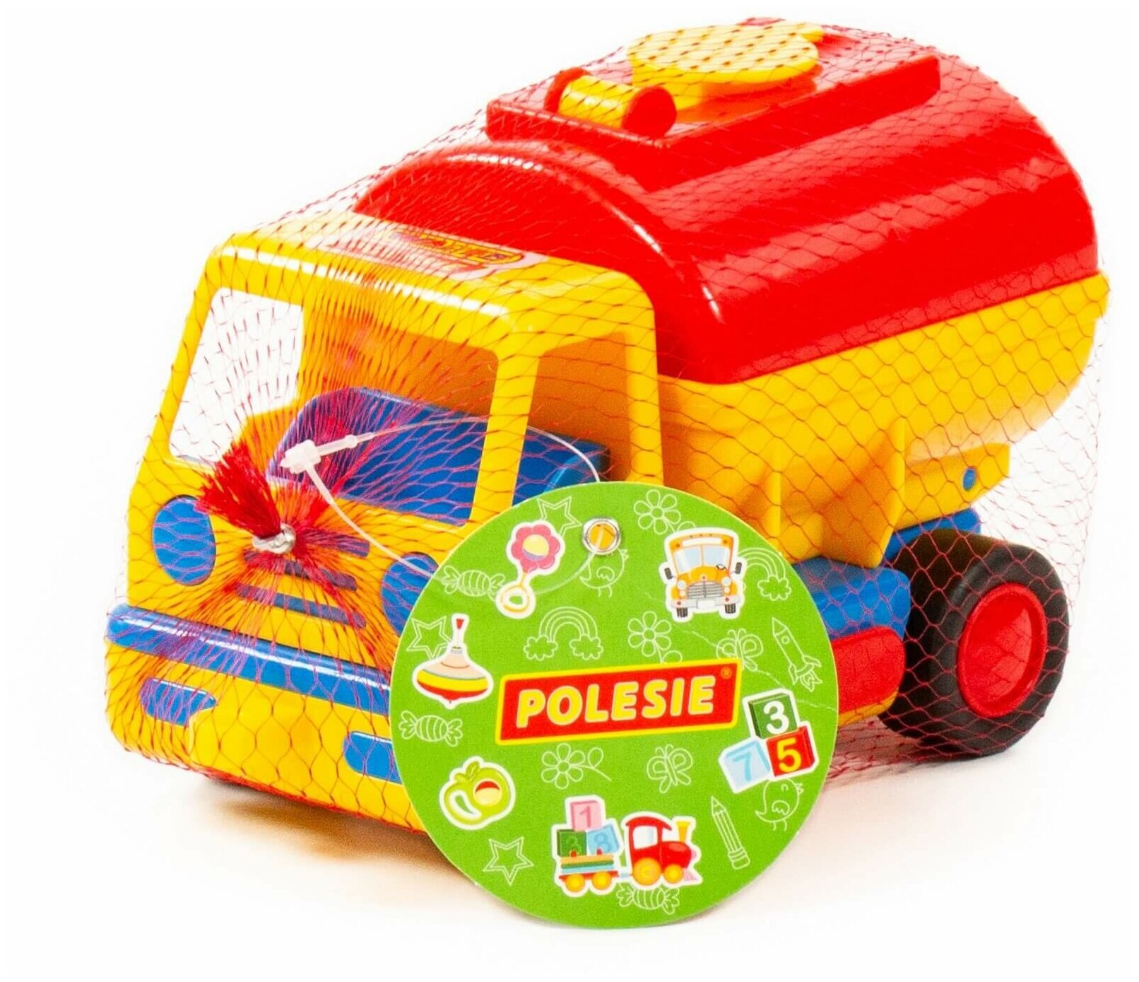 Автоцистерна порадует всех любителей спецтехники. В её герметичный кузов можно залить воду или насыпать песок. Для этого достаточно открыть люки на крыше. Прицеп транспорта можно легко откинуть как у самосвала. Благодаря большим пластиковым колёсам игрушка подойдёт для развлечений дома и на улице.