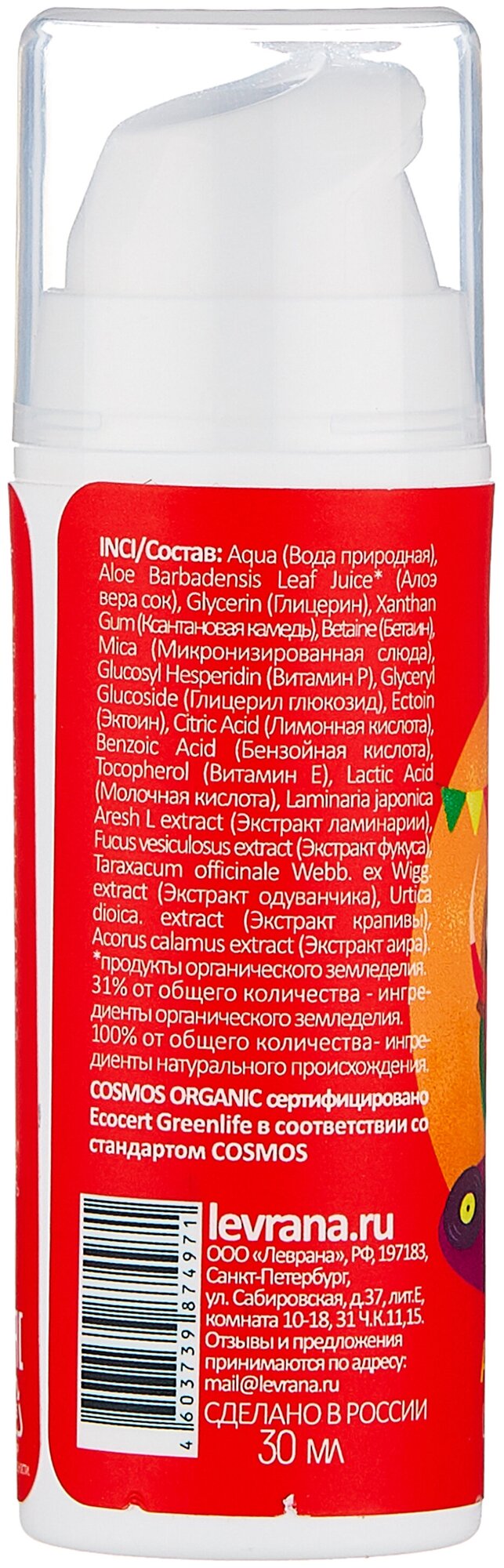 | Состав | Aqua (Вода природная), Aloe Barbadensis Leaf Juice* (Алоэ вера сок), Glycerin (Глицерин), Xanthan Gum (Ксантановая камедь), Betaine (Бетаин), Mica (Микронизированная слюда), Glucosyl Hesperidin (Витамин P), Glyceryl Glucoside (Глицерил глюкозид), Ectoin (Эктоин), Citric Acid (Лимонная кислота), Benzoic Acid (Бензойная кислота), Tocopherol (Витамин E), Lactic Acid (Молочная rислота), Laminaria japonica Aresh L extract (Экстракт ламинарии), Fucus vesiculosus extract (Экстракт фукуса), Taraxacum officinale Webb. ex Wigg. extract (Экстракт одуванчика), Urtica dioica. extract (Экстракт крапивы), Acorus calamus extract (Экстракт аира) |