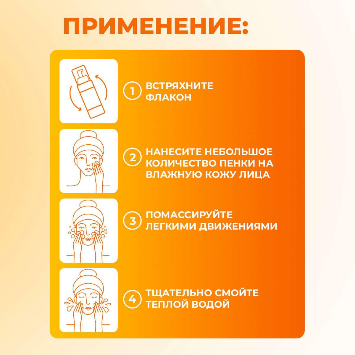 Встряхнуть флакон, нанести пенку на влажную кожу лица, помассировать и смыть теплой водой. Способ приготовленияПротивопоказания