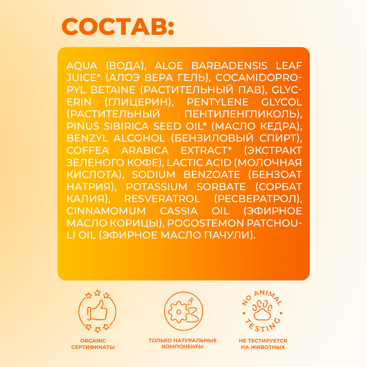 Aqua (Вода), Aloe Barbadensis Leaf Juice* (Алоэ вера гель), Cocamidopropyl Betaine (Растительный ПАВ), Glycerin (Глицерин), Pentylene Glycol (Растительный пентиленгликоль), Pinus Sibirica Seed Oil* (Масло кедра), Benzyl Alcohol (Бензиловый спирт), Coffea Arabica Extract* (Экстракт зеленого кофе), Lactic Acid (Молочная кислота), Sodium Benzoate (Бензоат натрия), Potassium Sorbate (Сорбат калия), Resveratrol (Ресвератрол), Cinnamomum Cassia Oil (Эфирное масло корицы), Pogostemon patchouli Oil (Эфирное масло пачули).