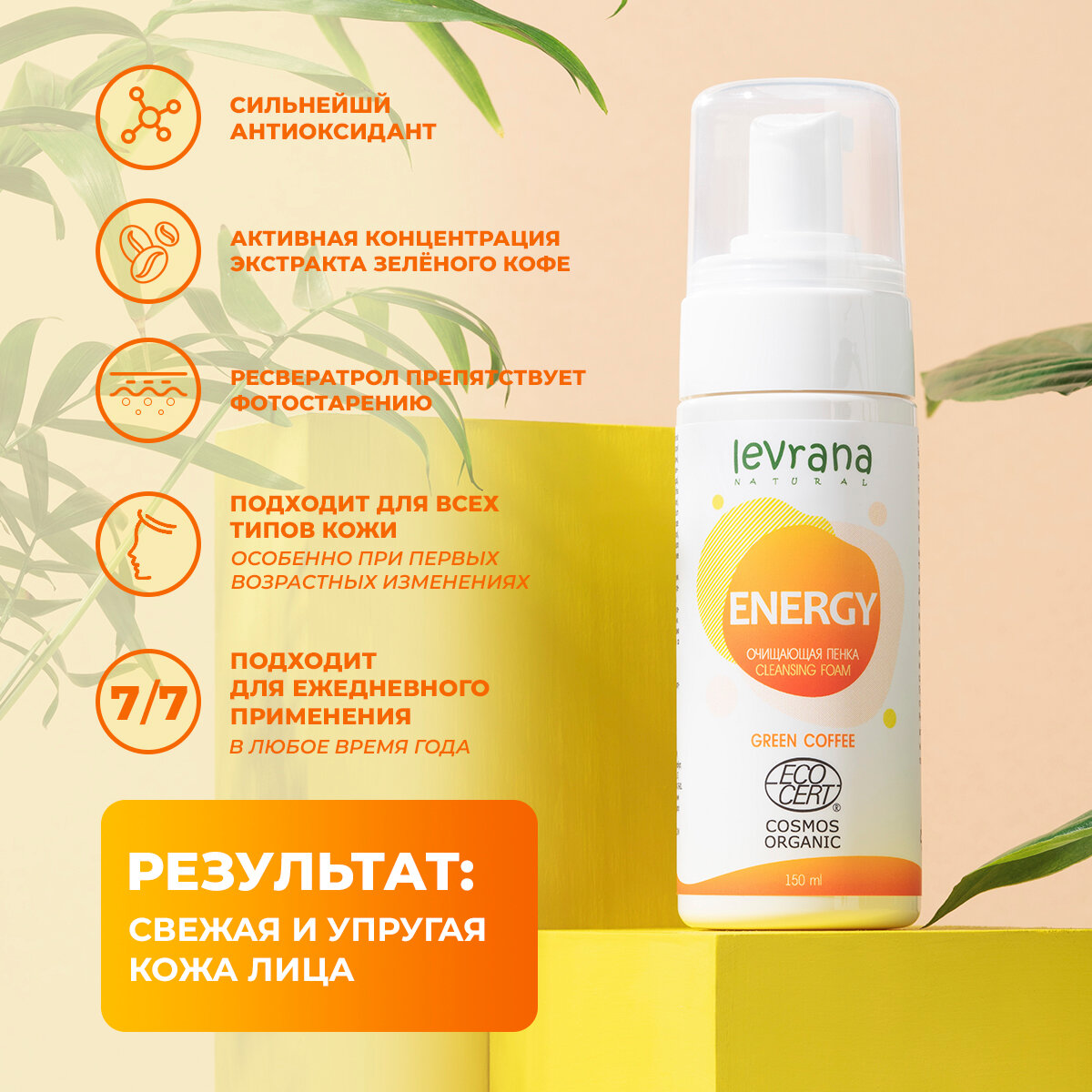 О ТОВАРЕБлагодаря активной концентрации экстракта зеленого кофе, пенка способствует тонизированию и повышению упругости кожи уже на этапе ее очищения.