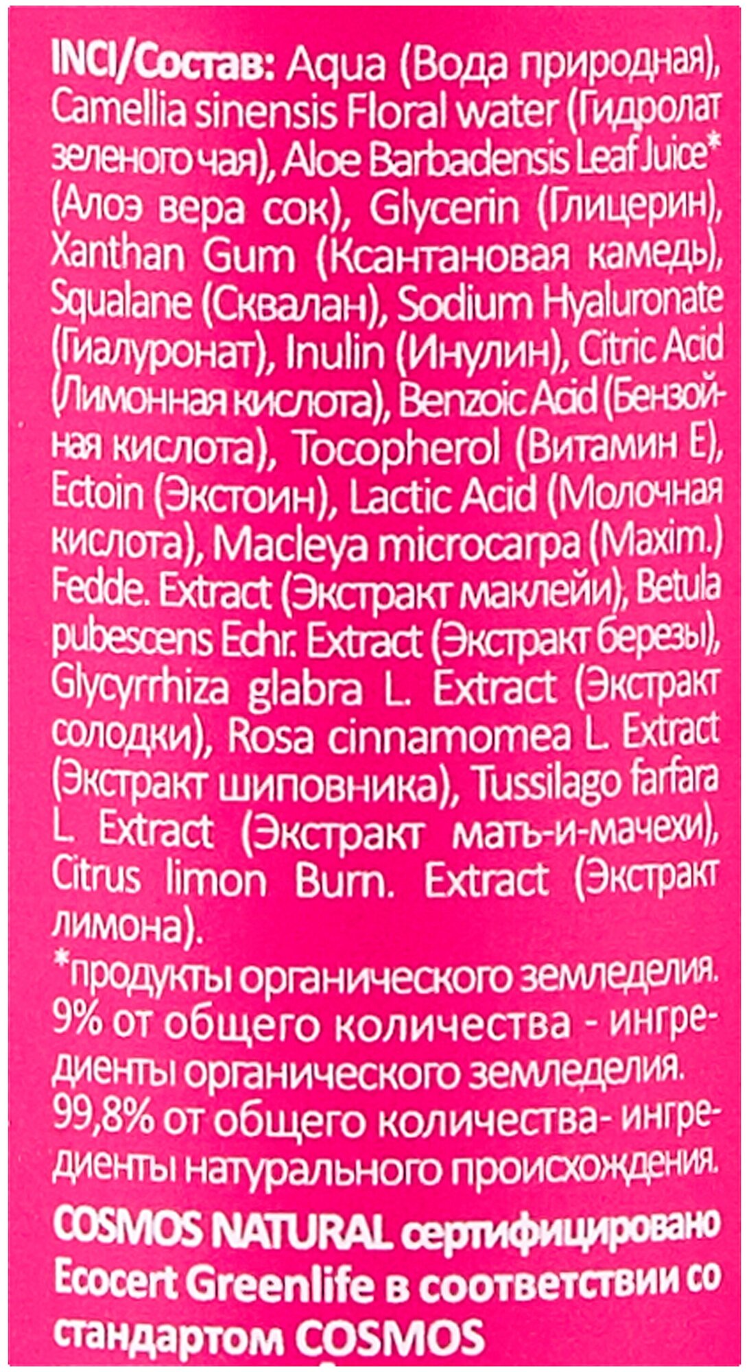 | Состав | Aqua (Вода природная), Camellia sinensis Floral water (Гидролат зеленого чая), Aloe Barbadensis Leaf Juice (Алоэ вера сок), Glycerin (Глицерин), Xanthan Gum (Ксантановая камедь), Squalane (Сквалан), Sodium Hyaluronate (Гиалуронат), Inulin (Инулин), Citric Acid (Лимонная кислота), Benzoic Acid (Бензойная кислота), Tocopherol (Витамин E), Ectoin (Эктоин), Lactic Acid (Молочная кислота), Macleya microcarpa (Maxim.) Fedde. Extract (Экстракт маклейи), Betula pubescens Echr. Extract (Экстракт березы), Glycyrrhiza glabra L. Extract (Экстракт солодки), Rosa cinnamomea L. Extract (Экстракт шиповника), Tussilago farfara L. Extract (Экстракт мать-и-мачехи), Citrus limon Burn. Extract (Экстракт лимона) |