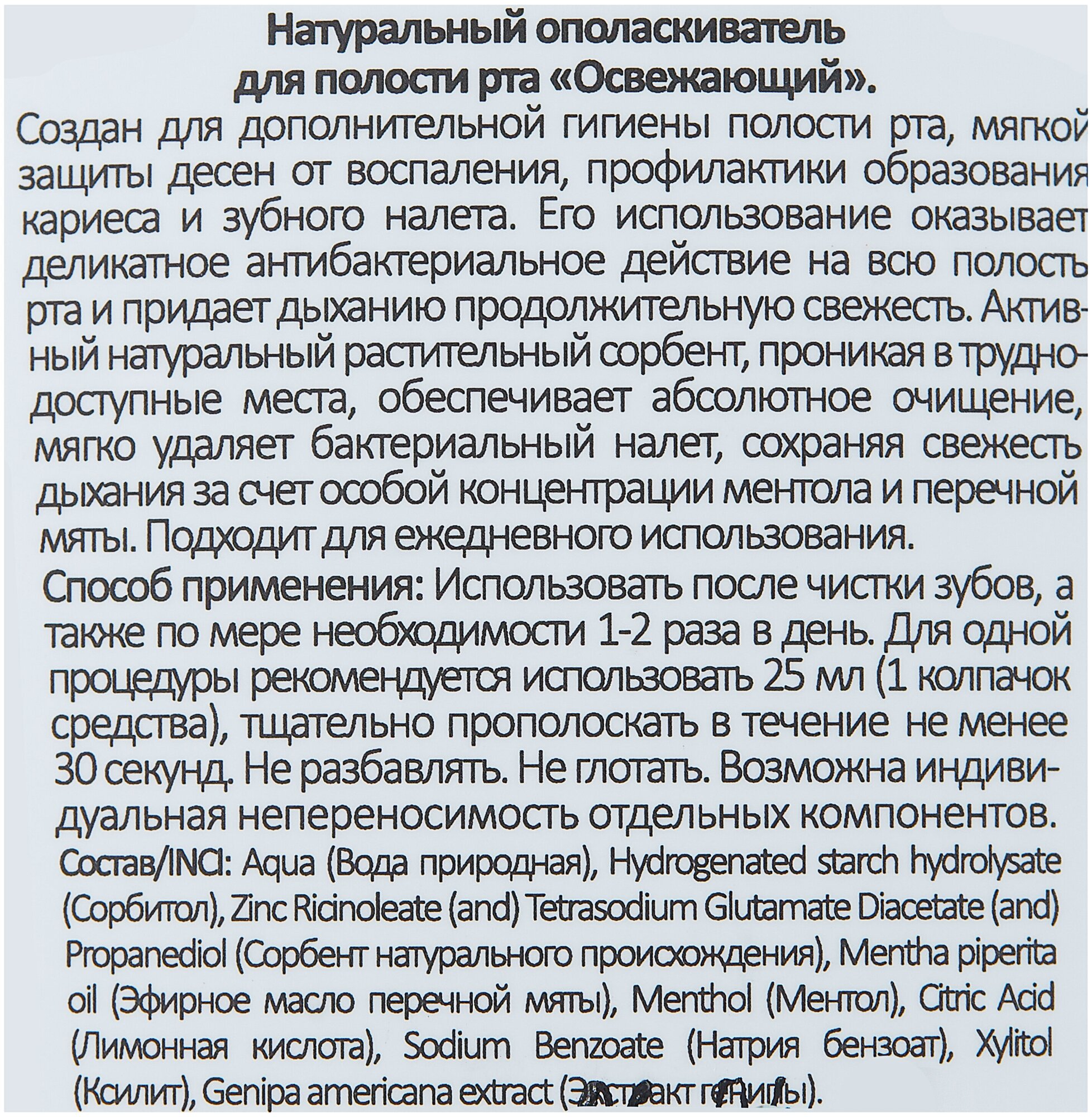 | Состав | Aqua (Вода природная), Hydrogenated starch hydrolysate (Сорбитол), Zinc Ricinoleate (and) Tetrasodium Glutamate Diacetate (and) Propanediol (Сорбент натурального происхождения), Mentha piperita oil (Эфирное масло перечной мяты), Menthol (Ментол), Citric Acid (Лимонная кислота), Sodium Benzoate (Натрия бензоат), Xylitol (Ксилит), Genipa americana extract (Экстракт генипы). |