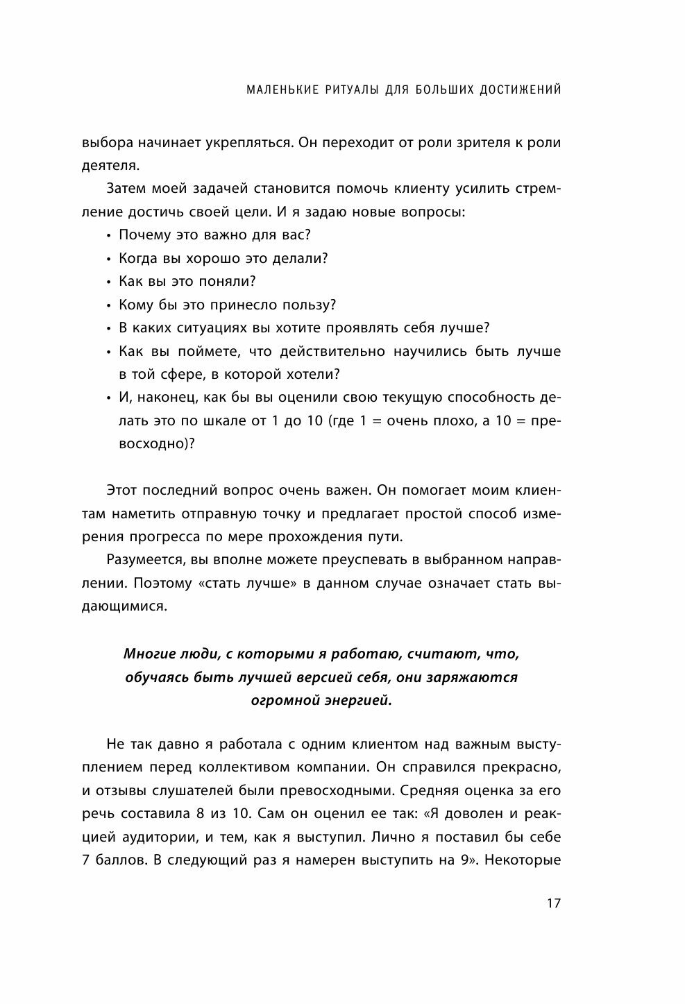 Я считаю эту книгу полезной и рекомендую к прочтению по двум причинам: во-первых, в основе книги лежит авторская методика известного практикующего коуча, во-вторых, эта методика состоит из очень простых ежедневных действий и ритуалов. Благодаря книге, вы сможете восстановить энергию тела, взять под контроль свои эмоции, а затем, выбрать большую цель и двигаться к ней.