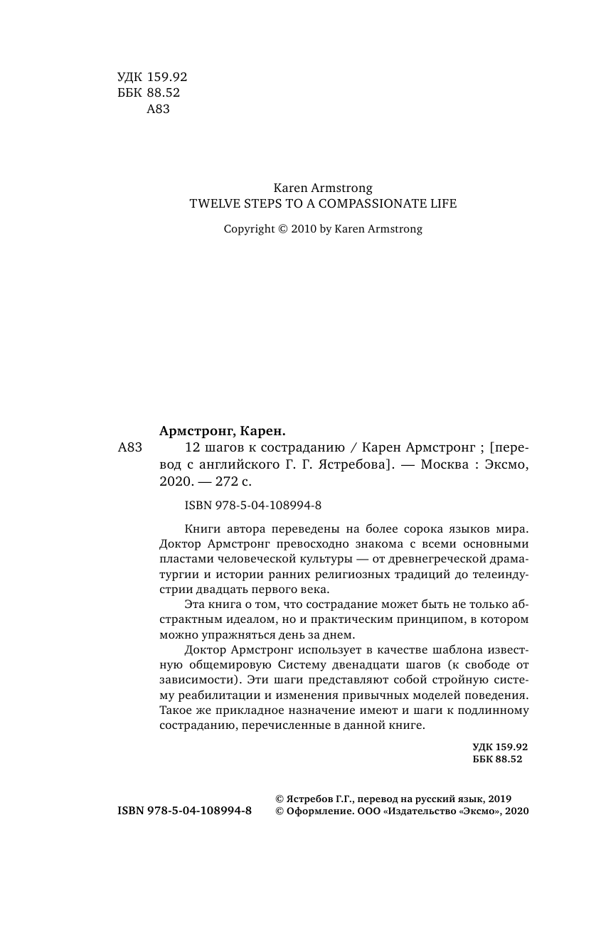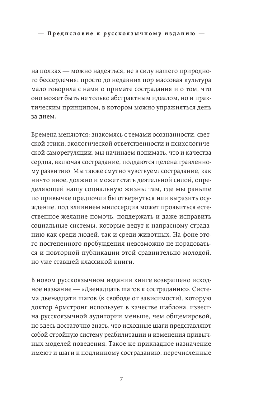 Доктор Армстронг использует в качестве шаблона известную общемировую Система двенадцати шагов (к свободе от зависимости). Эти шаги представляют собой стройную систему реабилитации и изменения привычных моделей поведения. Такое же прикладное назначение имеют и шаги к подлинному состраданию, перечисленные в данной книге.