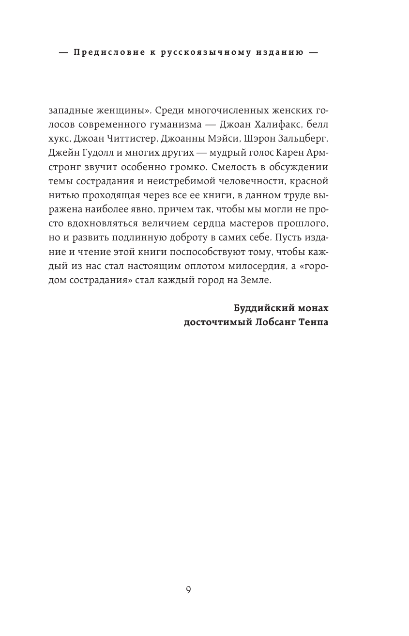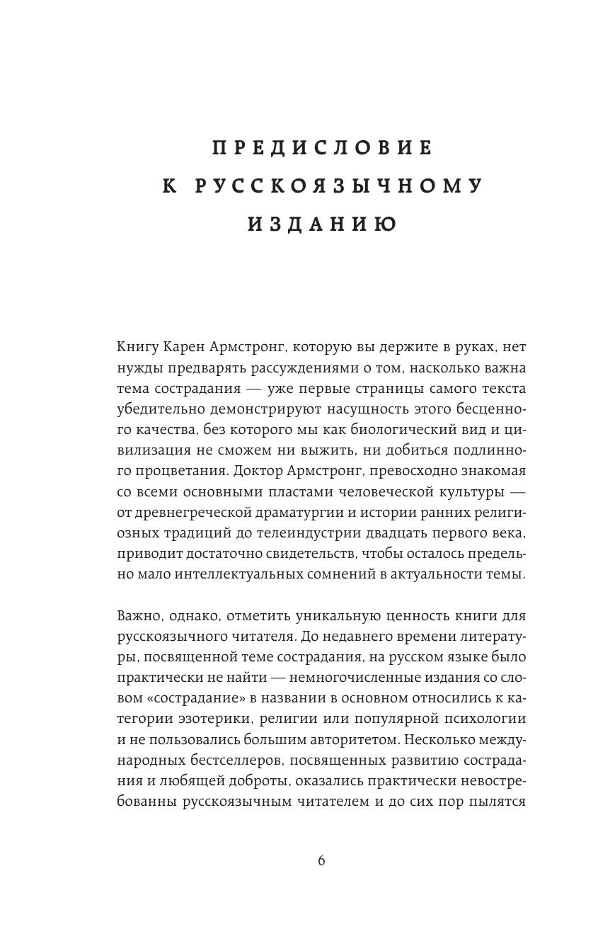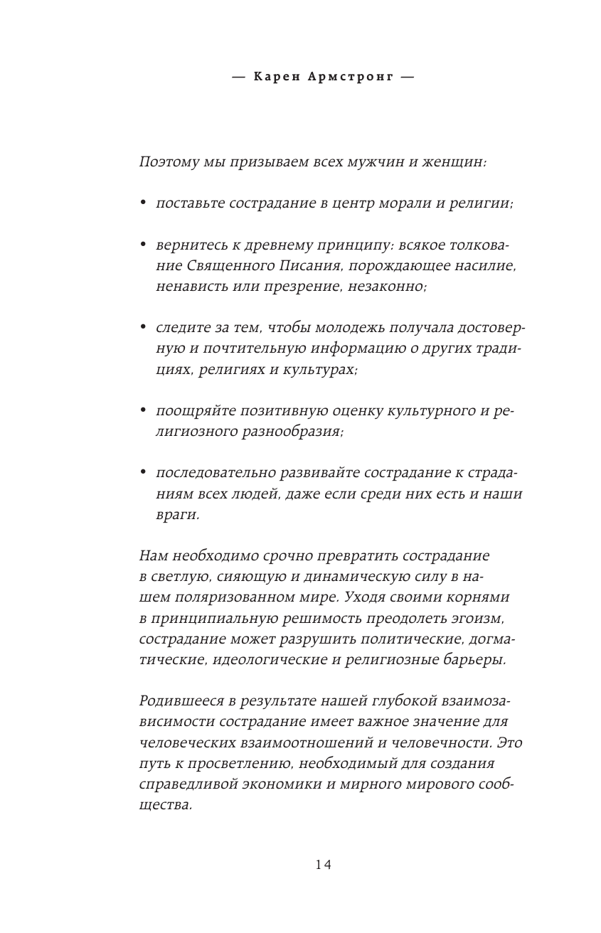 Очень, очень важная книга и, наверное, лучший подарок любому (в надежде, что люди однажды прочтут хотя бы часть). Разумеется, доктор Армстронг – одна из крупнейших историков религии, и именно потому ее объяснения опираются на этот пласт человеческой культуры (впрочем, с огромным числом историй и примеров из других сфер). Чудесно, что книга также помогает освоить медитацию на четырёх безмерных состояниях и вдохновляет на сострадательное поведение и активность в этом мире. Классика жанра.