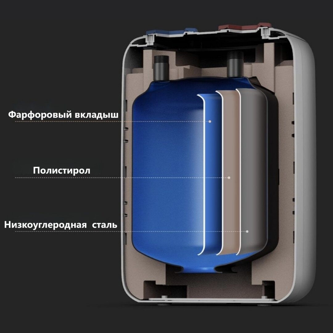 Резервуар для хранения воды во внутреннем баке имеет объем 6 литров. Этого объема достаточно для семьи из трех человек на повседневные бытовые потребности. Резервуар имеет минимальное количество деталей, поэтому он более прочный и обеспечивает максимальное давление. Фарфоровый вкладыш не подвержен коррозии.