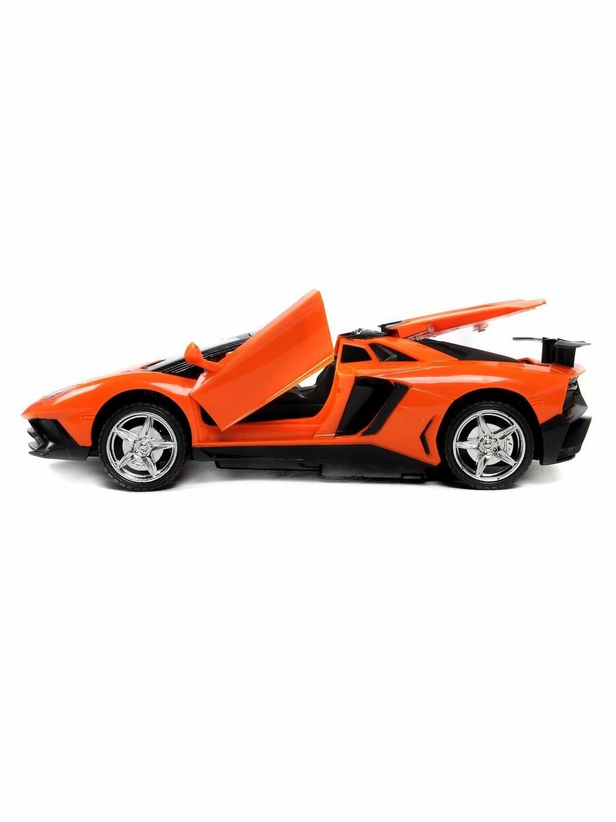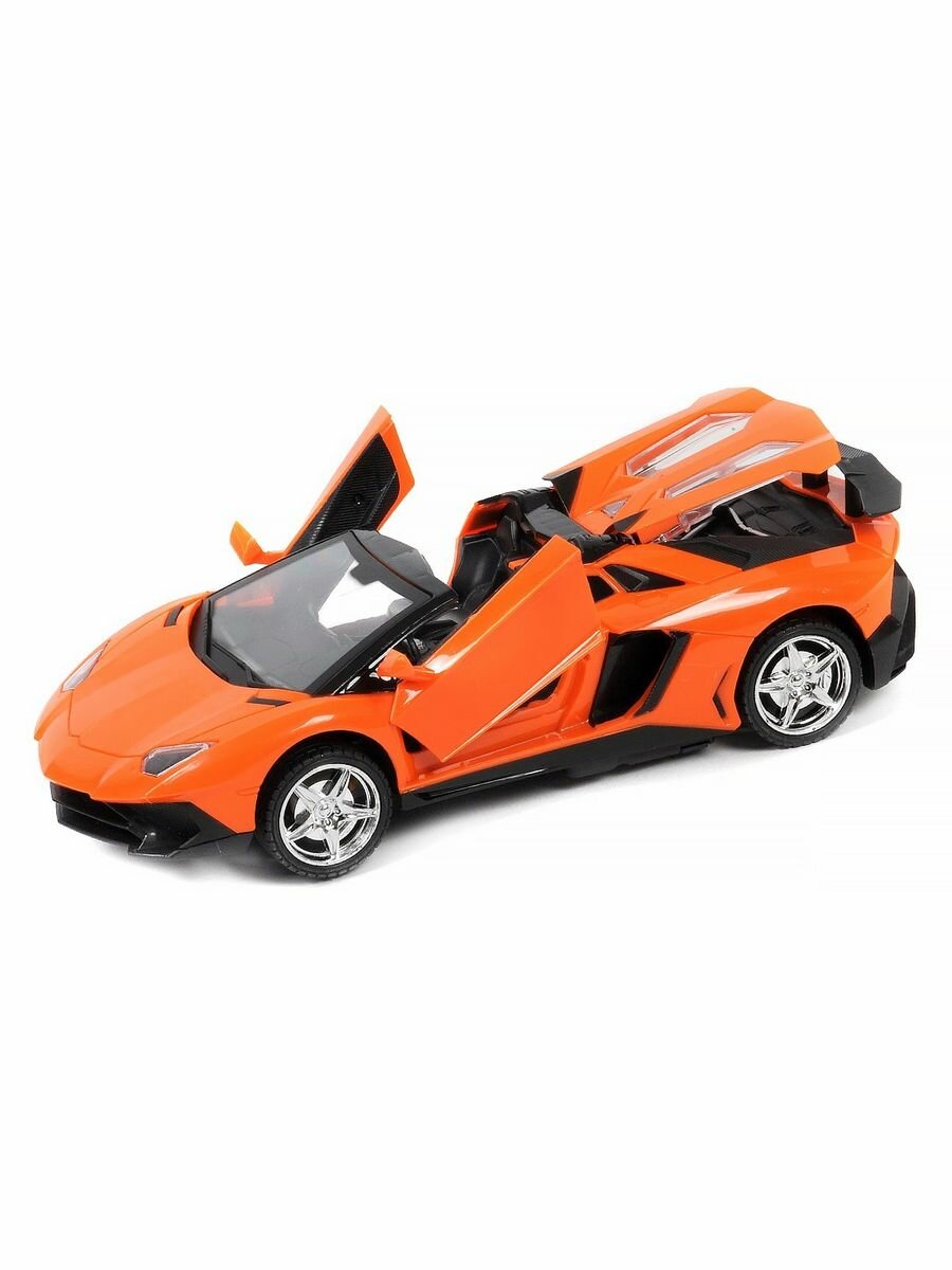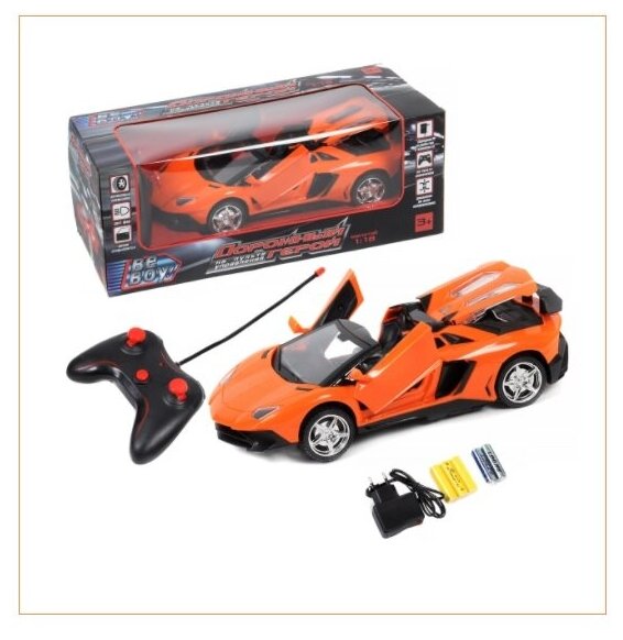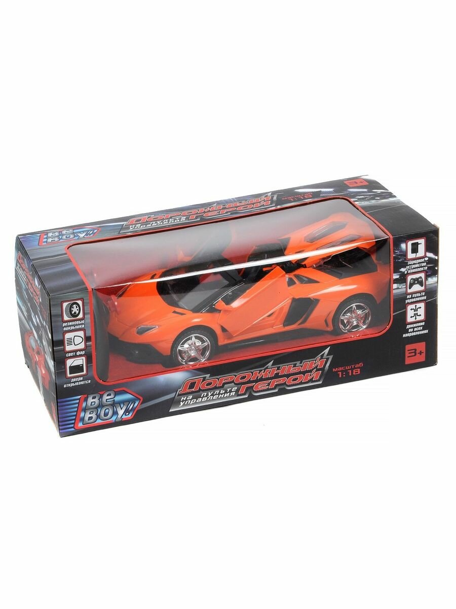 Движение во всех направлениях, резиновые покрышки, двери открываются с пульта управления, свет фар, М 1:18, цвета: желтый и оранжевый, в коробке 30,5*14*11,5 см.