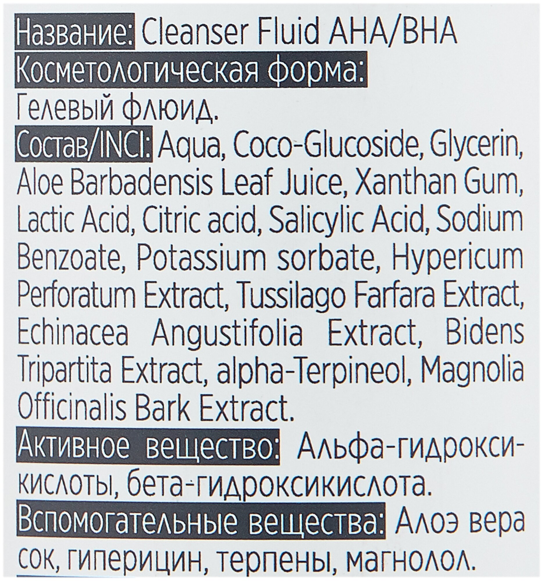 Прозрачный однородный гель с лёгкой текстурой и цветочно-миндальным запахом. Альфа-гидроксикислоты отшелушивают ороговевший слой эпидермиса, стимулируют регенерацию кожного покрова и синтез коллагена, эластина и гиалуроновой кислоты, увлажняют, повышают упругость и эластичность, продлевают молодость кожи, осветляют, обеспечивают антиоксидантную защиту. Бета-гидроксикислоты осуществляют удаление поверхностных мёртвых клеток кожи. Это позволяет раскрыть поры клеток и очистить их от избыточного себума, который часто способствует бактериальным инфекциям и воспалениям на проблемной коже. По многочисленным данным физико-химических исследований альфа-гидроксикислоты (АНА) оказывают положительное влияние на процесс кератинизации. Данные кислоты способствуют более быстрому продвижению кератиноцитов и усиленному отшелушиванию ороговевших клеток. Благодаря альфа-гидрокикислотам стимулируется процесс обновления эпидермиса. Бета-гидроксикислоты (ВНА) схожи с альфа-гидроксикислотами по своему происхождению, но имеют дополнительную углеродную группу, что делает их жирорастворимыми и способными проникать глубже в дермальные слои кожи под эпидермис. Салициловая кислота, наиболее известная в косметологии BHA, представляет собой двухосновную кислоту, которая делает обратимым процесс гликолизации клеток, тем самым замедляя старение кожи. СОСТАВ: Aqua, Coco-Glucoside, Glycerin, Aloe Barbadensis Leaf Juice, Xanthan Gum, Lactic Acid, Citric acid, Salicylic Acid, Sodium Benzoate, Potassium sorbate, Hypericum Perforatum Extract, Tussilago Farfara Extract, Echinacea Angustifolia Extract, Bidens Tripartita Extract, alpha-Terpineol, Magnolia Officinalis Bark Extract. СПОСОБ ПРИМЕНЕНИЯ: Нанести массирующими синусоидальными движениями по овалу лица, после вспенивания следует смыть флюид проточной водой. При необходимости повторить процедуру.
