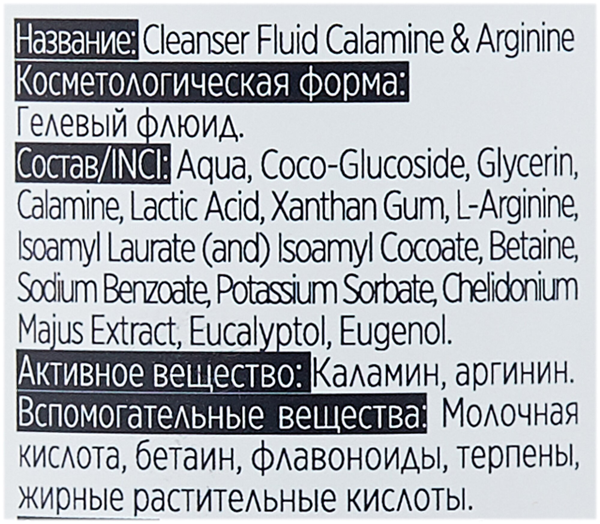 Однородная гелеобразная жидкость от светло-розового до розового цвета с мятно-пряным запахом. Очищающий флюид с каламином и аргинином служит для мягкого очищения чувствительной, раздражённой и воспалённой кожи. Содержит, помимо активных антибактериальных и противовоспалительных компонентов, смягчающие эпидермис бетаин, эфиры жирных кислот кокосового масла, кератолитик и хумектант, молочную кислоту. Минеральный активный компонент каламин (Calamine) обладает антисептическим и противовоспалительным действием, снимает зуд, успокаивает кожу и создаёт защитный барьер на её повреждённых участках. Каламин, будучи нерастворимым в воде и жирах, не проникает и не накапливается в коже. В паре с L-Аргинином (L-Arginine), он понижает чувствительность раздраженной кожи к внешним факторам. Аргинин частично заменимая аминокислота, участвующая во внутриклеточном синтезе NO (оксида азота), играющего биологическую роль в стимуляции ангиогенеза и борьбе с воспалительными процессами. СОСТАВ: Aqua, Coco-Glucoside, Glycerin, Calamine, Lactic Acid, Xanthan Gum, L-Arginine, Isoamyl Laurate (and) Isoamyl Cocoate, Betaine, Sodium Benzoate, Potassium Sorbate, Chelidonium Majus Extract, Eucalyptol, Eugenol. СПОСОБ ПРИМЕНЕНИЯ: Нанести небольшое количество средства на влажную кожу лица, помассировать до образования пены, смыть полностью водой.