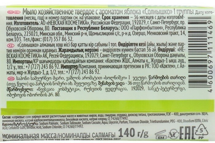 На сегодняшний день товар «Мыло хозяйственное Невская Косметика "Солнышко" с ароматом яблока 140гр (11146**)» можно купить с кешбеком в 1 магазине: Яндекс.Маркет