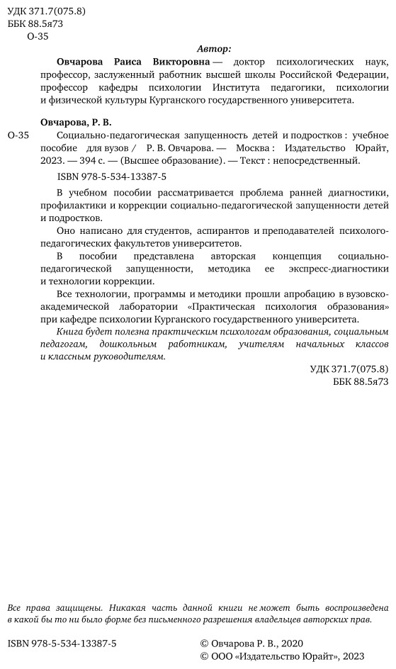 Социально-педагогическая запущенность детей и подростков. Учебное пособие для вузов (Раиса Викторовна Овчарова); ЮРАЙТ, 2020
