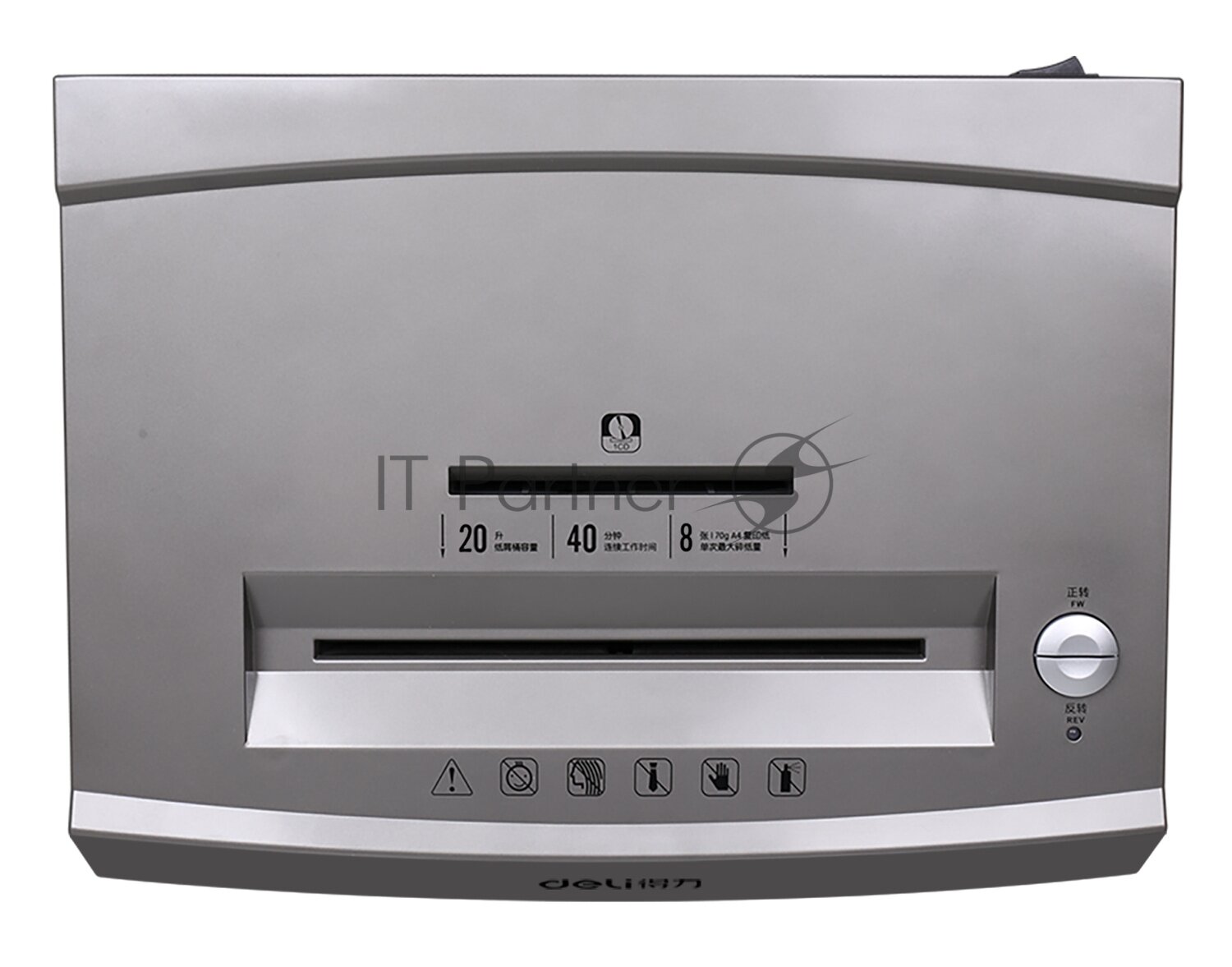 Шредер Deli серебристый с автоподачей (секр.P-4)/фрагменты/8лист./20лтр./скрепки/скобы/пл.карты/CD