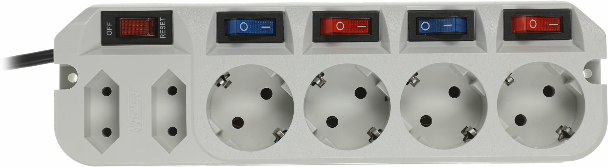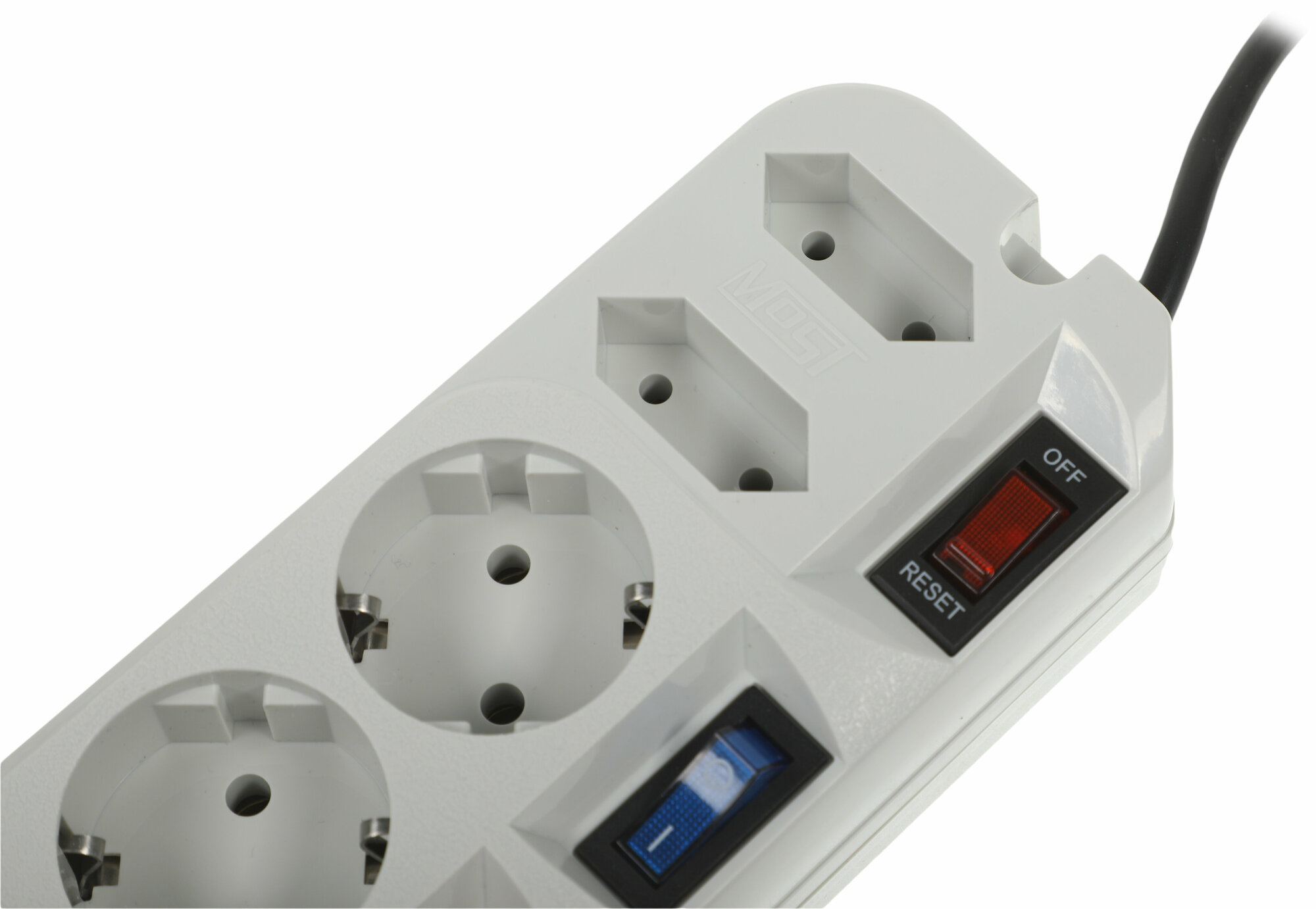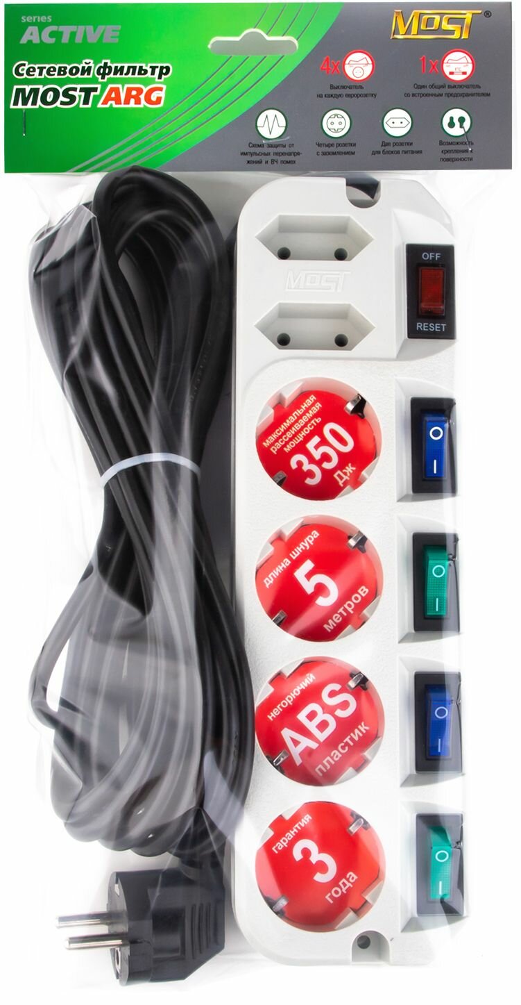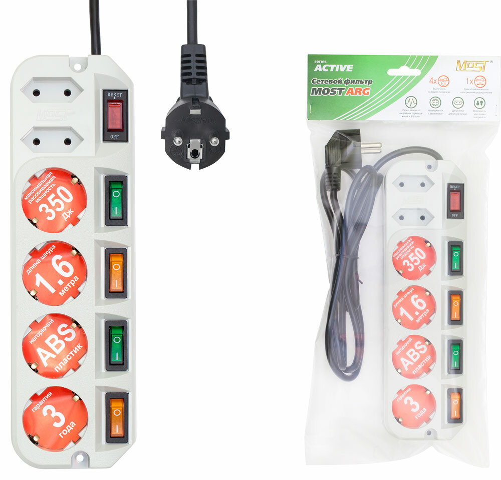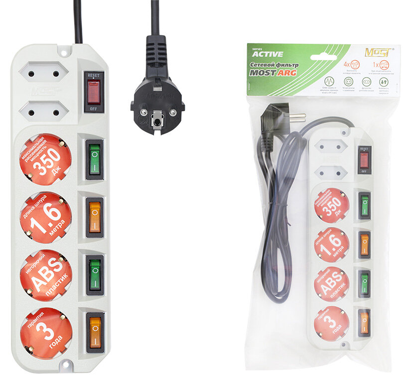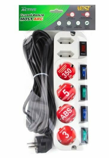 Сетевой фильтр МОST EНV имеет широкий выключатель с индикацией включения, разрывающий фазную и нулевую линии питания, индивидуальный выключатель на каждую розетку, автоматический предохранитель на 10А, электронную схему подавления помех, схему для защиты техники от опасного повышенного напряжения в сети выше 250 В (защита от 380 Вольт).
