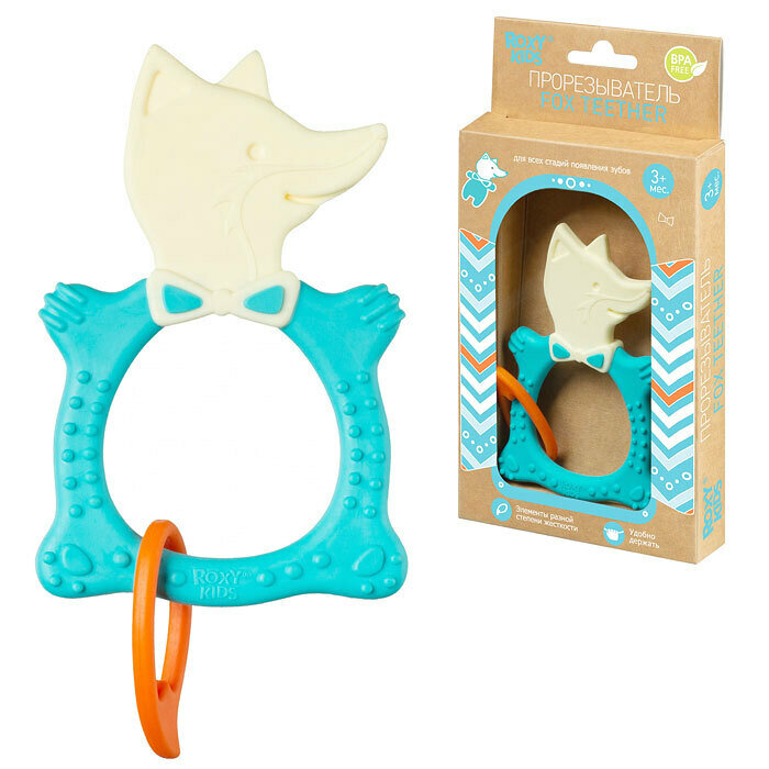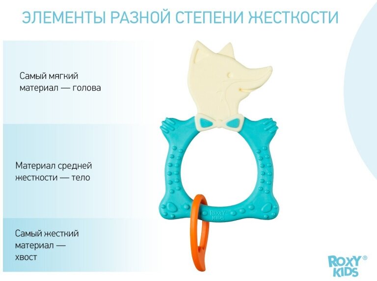 различной степени жесткости. На начальном этапе, когда у малыша раздражены десны, он может чесать их о мягкую рельефную голову лисенка,Потом уже грызть более твердое тело и твердый хвост. Еще