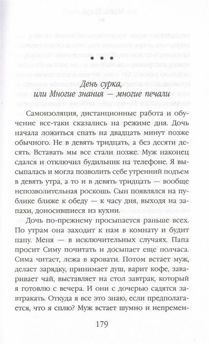 Хорошо, что и про самоизоляцию кто-то пишет) Истории очень жизненные, такие обычные. Ну, правда! Все мои знакомые мамочки осваивали новые рецепты, попадали в объектив камеры ноутбука или планшета в растянутой майке и с пучком на голове, перетянутом почти трусами. Автор в своей манере перенесла все на бумагу)