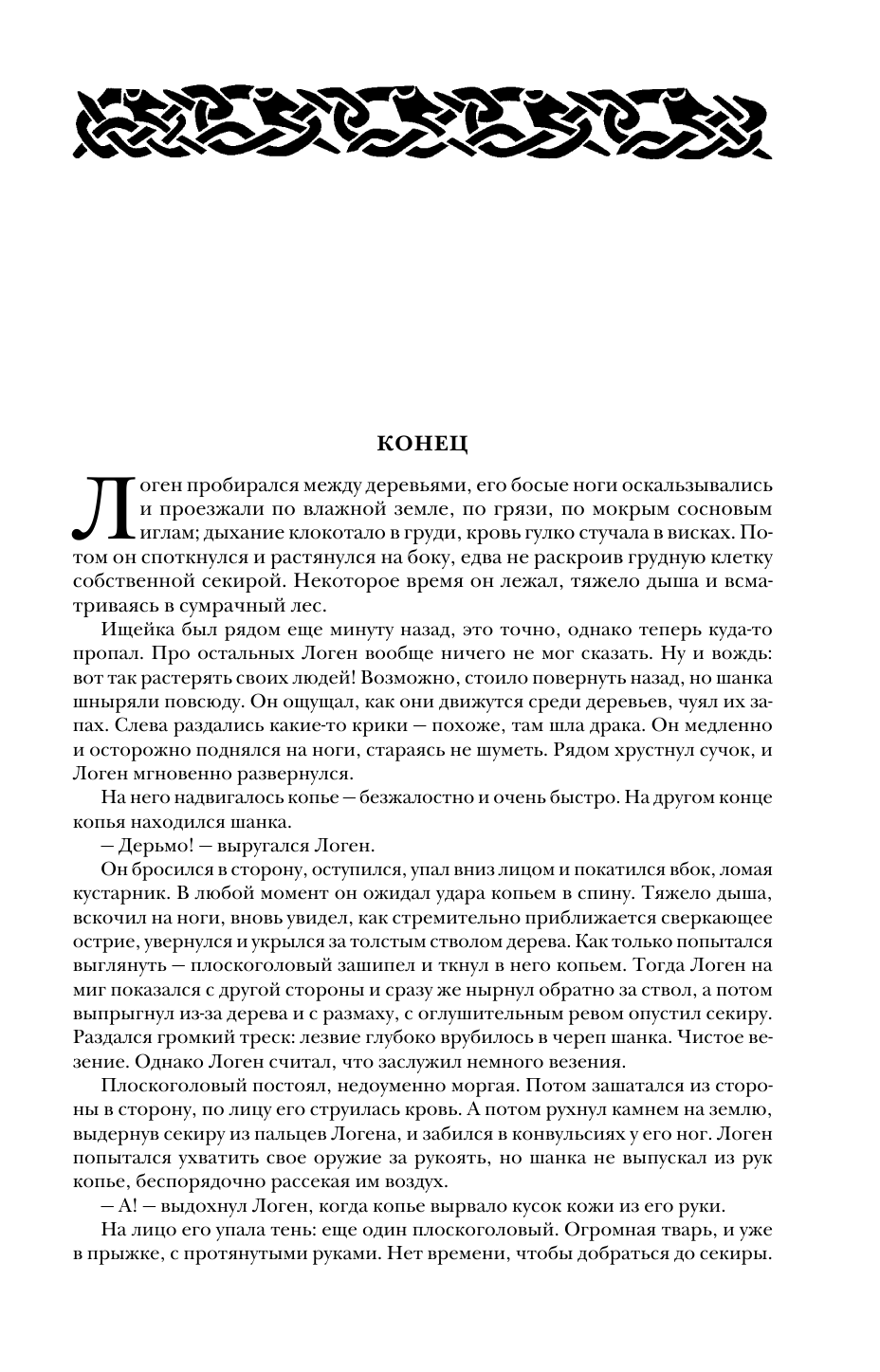 Роковой поворот колеса фортуны сводит Первого Мага Байяза, бесстрашного варвара Логена Девять Смертей и изнеженного аристократа Джезаля дан Луфара - им предстоит опаснейшее путешествие на край Земного Круга. Каким образом с ними связан хромой калека-инквизитор Глокта? Как их выбор скажется на судьбе Союза? Что есть Первый Закон Магии?