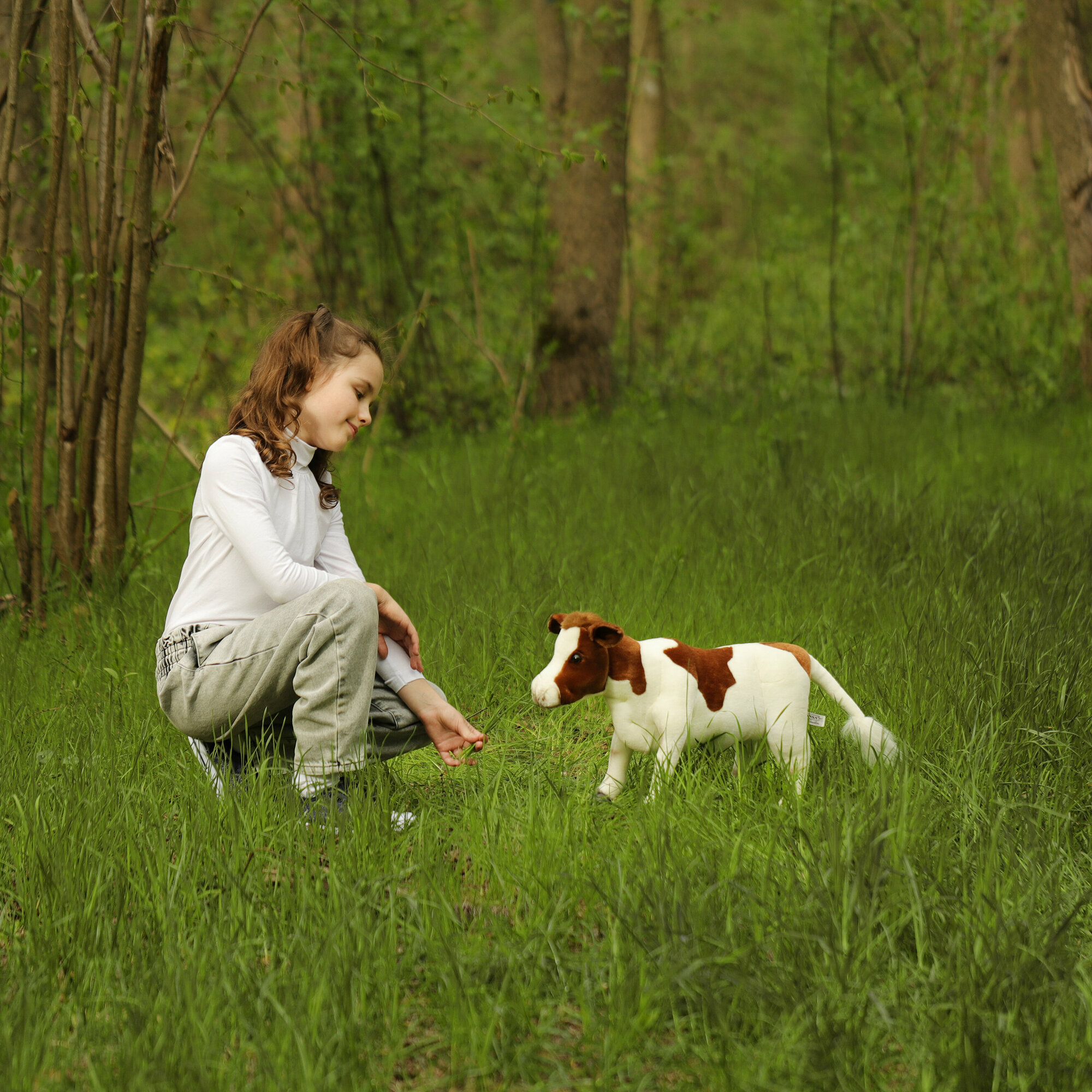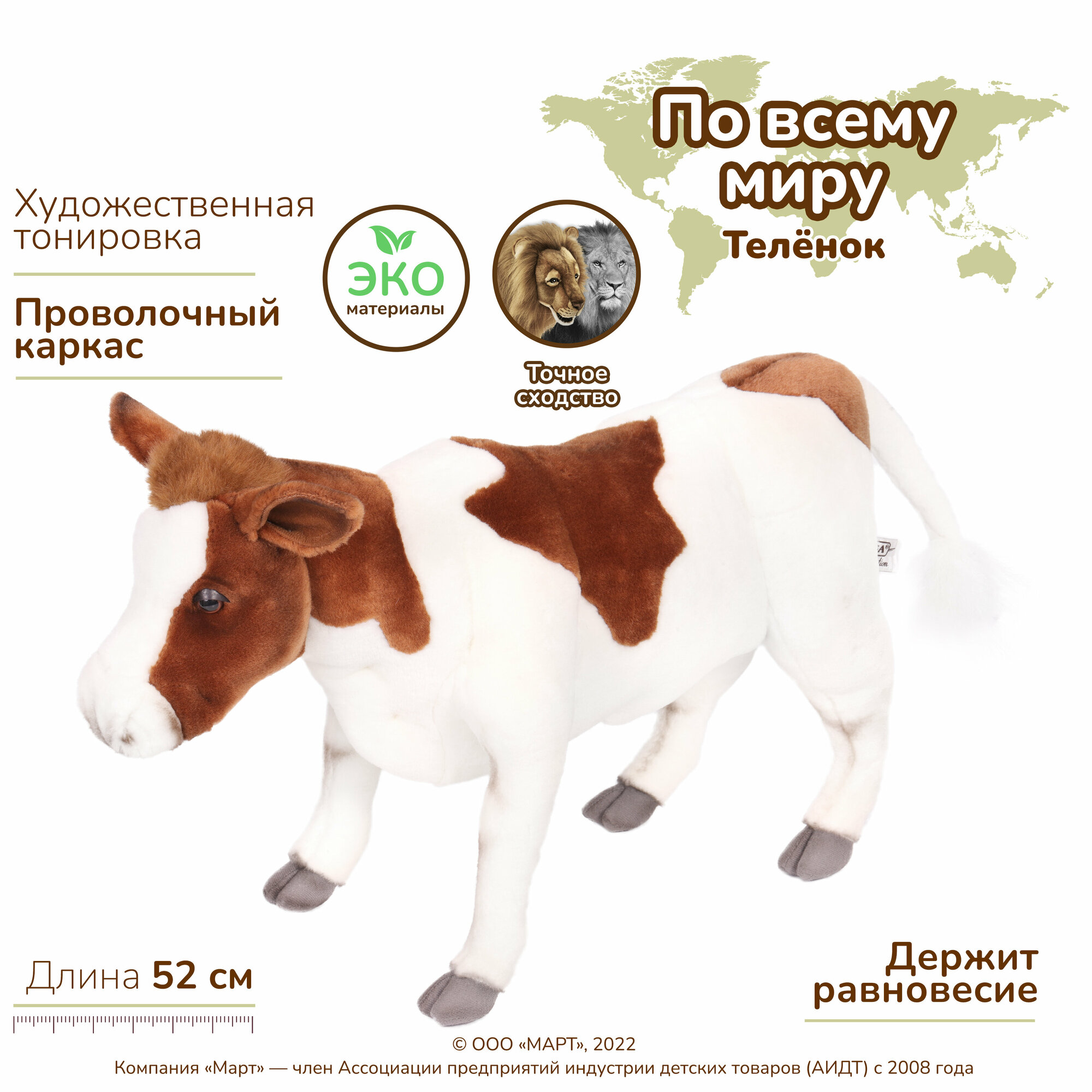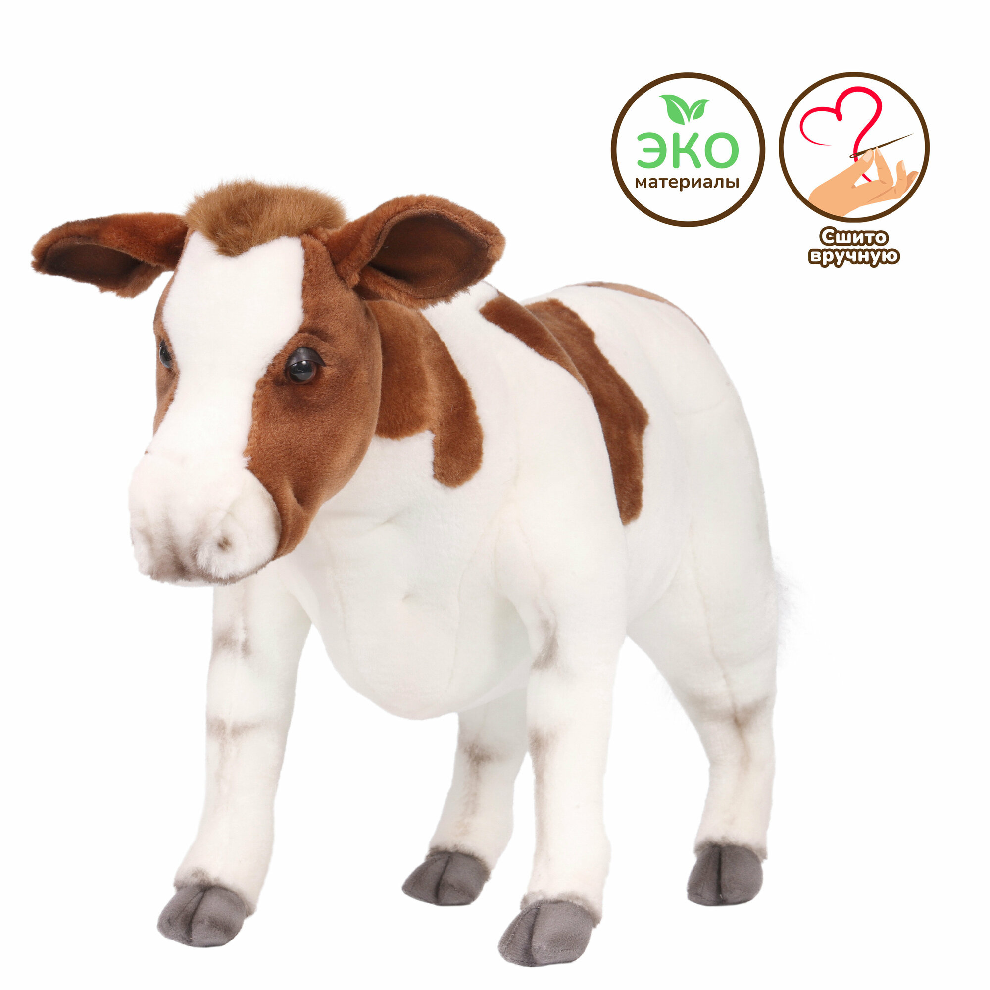 Существует миф, что корова глупа. «Петрушки» действительно плохо поддаются дрессировке, но не потому, что у них не богато ума! Эти животные очень своенравны и свободолюбивы. Загляните в глаза мягкой игрушке «Теленок коричневый» от компании Hansa – вы увидите, сколько в его взгляде собственного достоинства. Изделие - точная, хотя и сильно уменьшенная копия настоящего животного. Шёрстка игрушечного теленка изготовлена из коричнево-белого плюша, повторяющего фактуру и окрас шерсти живого прототипа. Крупная голова игрушки, увенчанная ушками – «лопушками» с капроновым наполнителем, «рост» в 52 см вселяют уважение. Проволочный каркас, глубоко спрятанный в теле игрушки, хорошо держит ее форму, позволяя прочно стоять на всех четырех ногах. Плюшевый теленок от Hansa станет достойным украшением коллекции, реквизитом тематических игр и фотосессий.Ярлычок с краткой справочной информацией, прикрепленный к игрушке, позволит узнать подробности о жизни и повадках этого животного.Изготовленные вручную мягкие игрушки Hansa Creation дарят ощущение уюта и вызывают самые тёплые эмоции. Образы от Hansa Creation воодушевляют на более внимательное изучение мира животных, их повадок, среды обитания, а также напоминают о необходимости защиты нашей природы.