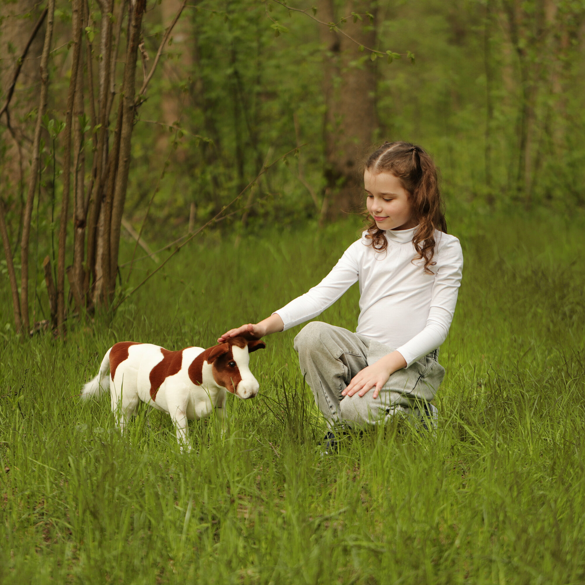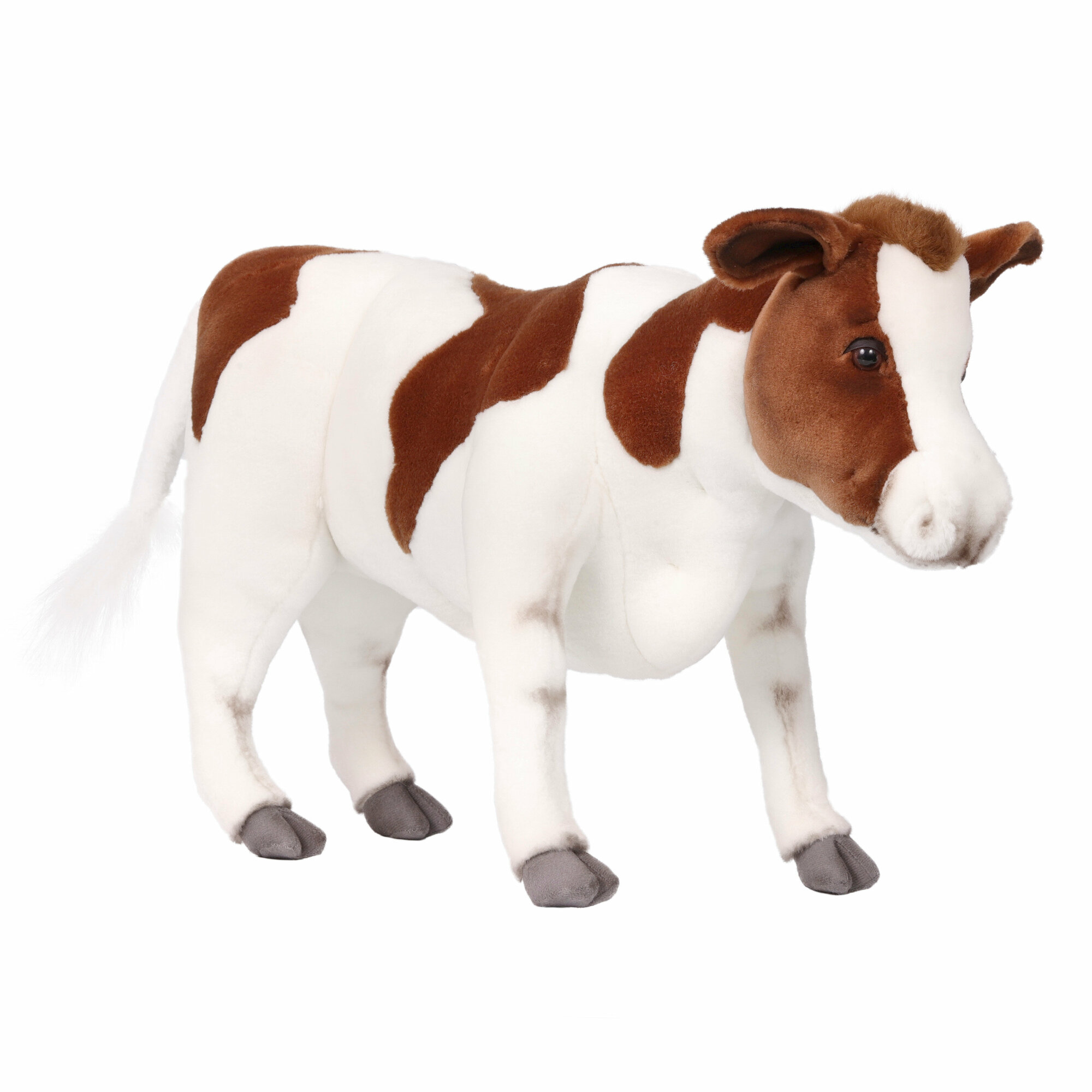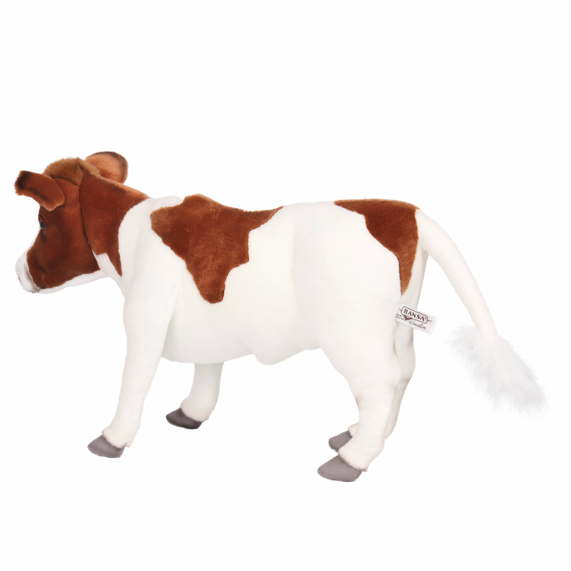 Существует миф, что корова глупа. «Петрушки» действительно плохо поддаются дрессировке, но не потому, что у них не богато ума! Эти животные очень своенравны и свободолюбивы. Загляните в глаза мягкой игрушке «Теленок коричневый» от компании Hansa – вы увидите, сколько в его взгляде собственного достоинства. Изделие - точная, хотя и сильно уменьшенная копия настоящего животного. Шёрстка игрушечного теленка изготовлена из коричнево-белого плюша, повторяющего фактуру и окрас шерсти живого прототипа. Крупная голова игрушки, увенчанная ушками – «лопушками» с капроновым наполнителем, «рост» в 52 см вселяют уважение. Проволочный каркас, глубоко спрятанный в теле игрушки, хорошо держит ее форму, позволяя прочно стоять на всех четырех ногах. Плюшевый теленок от Hansa станет достойным украшением коллекции, реквизитом тематических игр и фотосессий.Ярлычок с краткой справочной информацией, прикрепленный к игрушке, позволит узнать подробности о жизни и повадках этого животного.Изготовленные вручную мягкие игрушки Hansa Creation дарят ощущение уюта и вызывают самые тёплые эмоции. Образы от Hansa Creation воодушевляют на более внимательное изучение мира животных, их повадок, среды обитания, а также напоминают о необходимости защиты нашей природы.