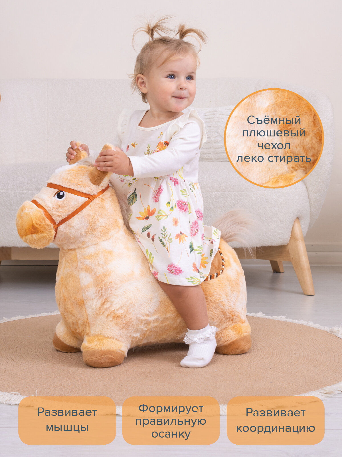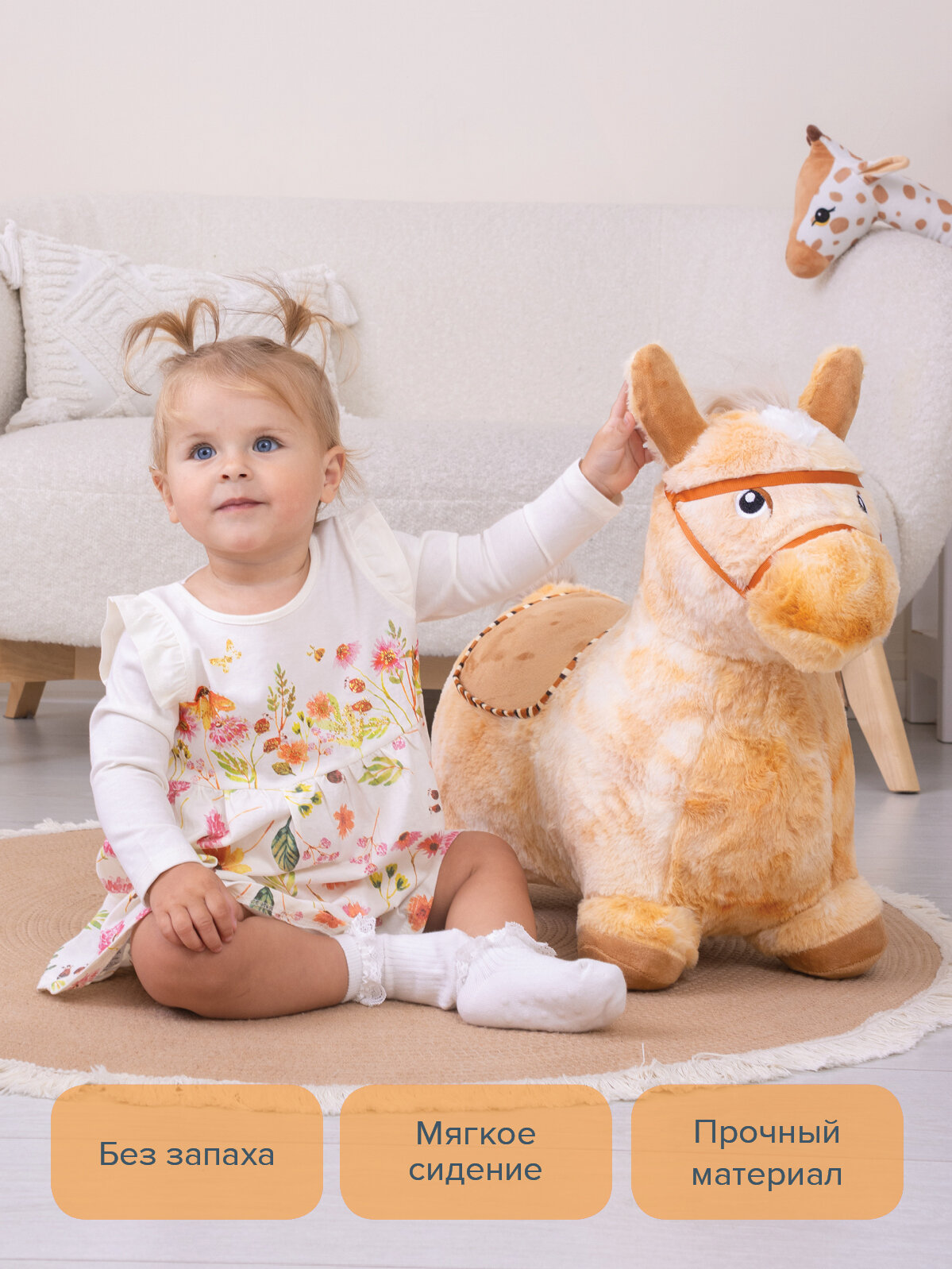 Купили годовалому малышу играть под присмотром. Первые пару дней ребёнок боялся (большая для годовалого игрушка), но на третий день за уши не оттащить! Прыгает на ней, жмёт кнопку, чтобы лошадка издавала цокот копыт и ржание, радости ребёнка нет предела. Ещё и цокать научился. Классная игрушка, мягкая,запах выветрился за день, чехол можно стирать. Мы довольны.