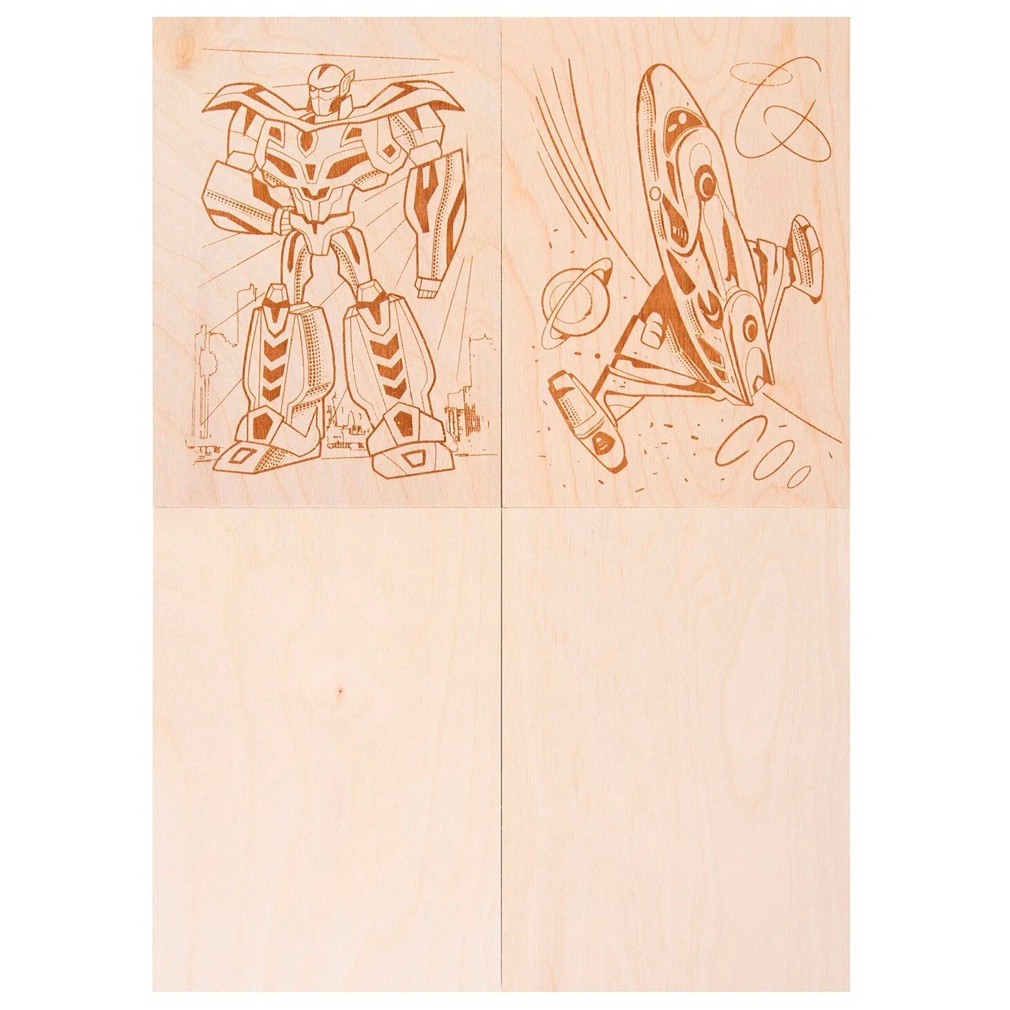 Доски имеют одинаковую прямоугольную форму и размер 21 х 15 см. Две доски уже обладают нанесенным контуром рисунка, а другие две – чистые.
