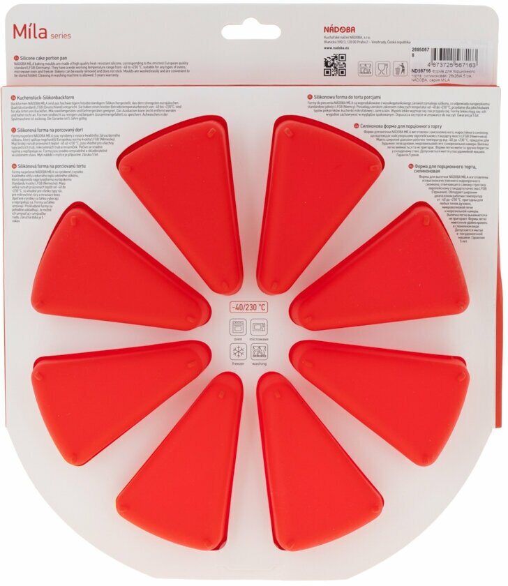 | Прочие особенности и свойства | Формы для выпечки Mila изготовлены из высококачественного жаропрочного силикона, отвечающего самому строгому европейскому стандарту качества LFGB (Германия). Обладают широким диапазоном рабочих температур от -40 до +230 °С, пригодны для любых типов духовок, микроволновой печи и морозильной камеры. Выпечка легко вынимается и не пригорает. Формы легко моются и их удобно хранить в сложенном виде. Гарантия на формы для выпечки серии Mila 5 лет. |