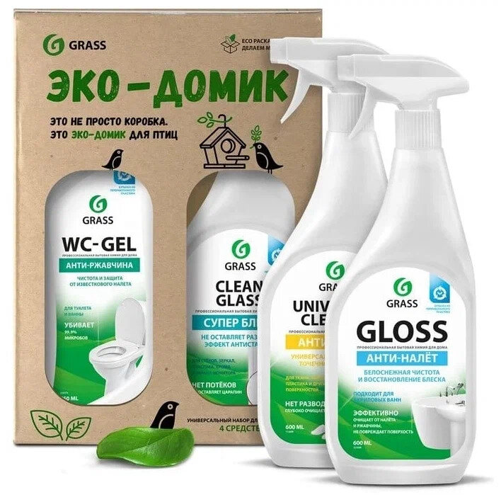 Универсальный набор для уборки Дома №1: 1. Wc-Gel Кислотное чистящее средство для чистки унитазов, фаянсовых изделий, кафеля от известкового налета, потеков ржавчины, солевых отложений, 750 мл. 2.Clean Glass Универсальный очиститель для стекол, зеркал, пластика, хрома, кафеля. Не оставляет подтеков, разводов, экономичен в применении, 600 мл. 3. Gloss Универсальное моющее средство на основе лимонной кислоты для ванной комнаты и кухни, 600 мл. 4. Universal Cleaner Универсальное пенное моющее средство широкого спектра действия. Эффективно удаляет загрязнения с водостойких поверхностей, 600 мл.