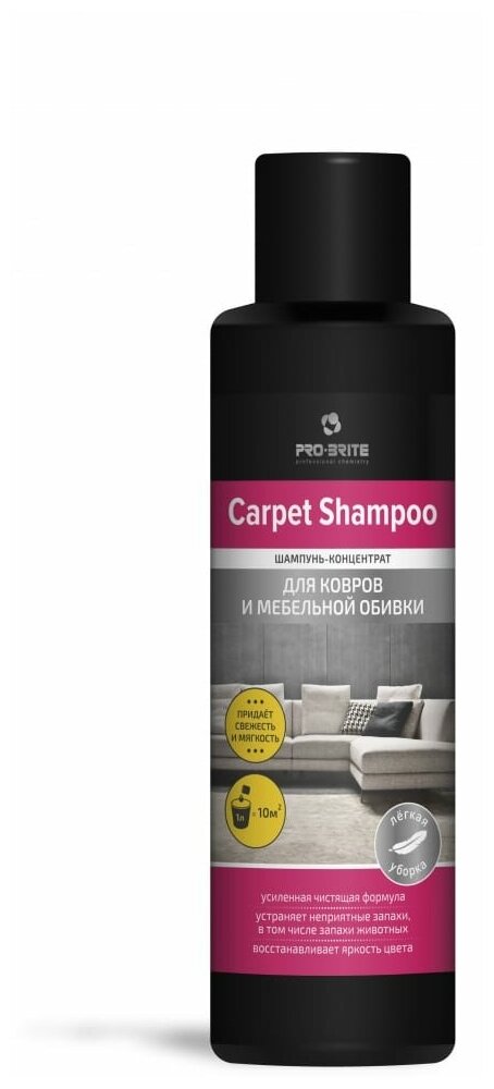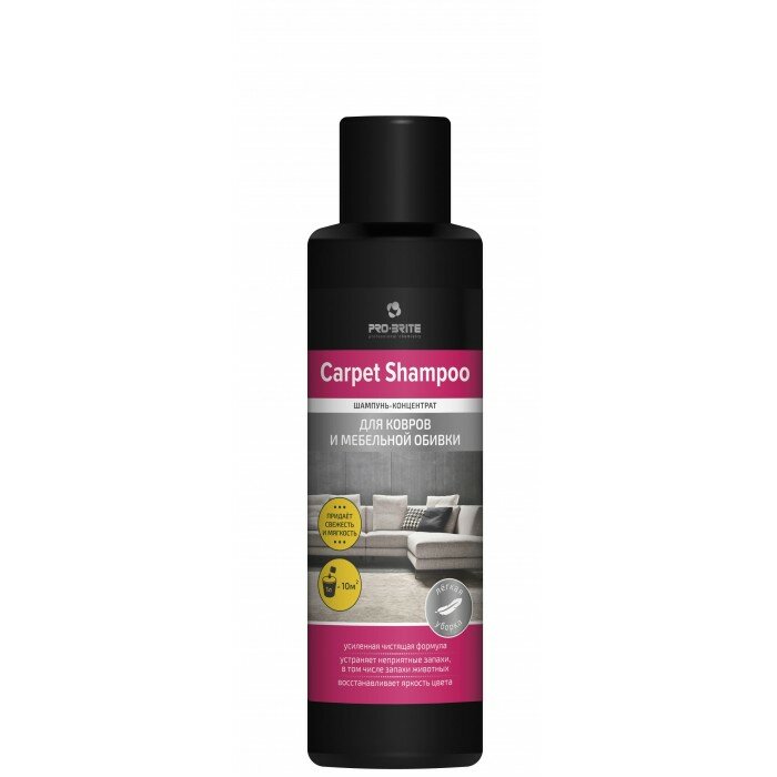 «Carpet shampoo Шампунь-концентрат для ковров и мебельной обивки», арт. 1530-05 Описание: чистящее средство для текстильной обивки, мягкой мебели и ковровых покрытий. Применимо для чистки с парогенератором. Свойства: концентрат против жировых, улично-бытовых и др. загрязнений. Глубоко проникает в волокна ткани, не повреждая их. Восстанавливает вид поверхности. Удаляет неприятные запахи (дыма, сырости, домашних животных и др.). Придаёт аромат свежести. Пожаро- и взрывобезопасный. Замерзает, после размораживания свойства сохраняются. Способ применения: предварительно очистить поверхность пылесосом! Проверить стойкость красителя ткани на незаметном участке! Температурный режим применения 20-95°С. Использовать распылением, вручную или с парогенератором. Норма расхода готового раствора 100-150мл/м².