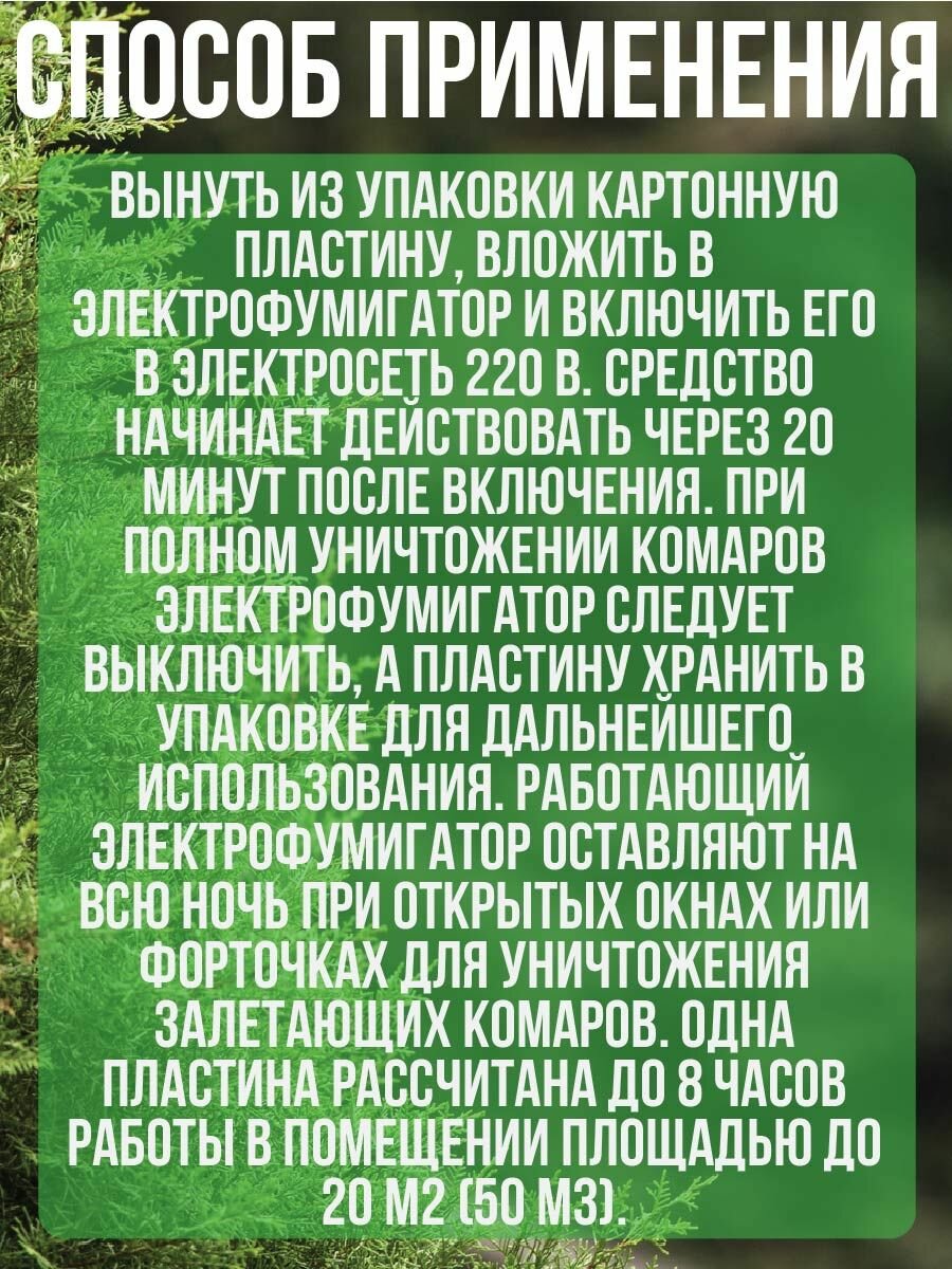 Способ применения: вынуть из упаковки картонную пластину, вложить в электрофумигатор и включить его в электросеть 220 В. Средство начинает действовать через 20 минут после включения. При полном уничтожении комаров электрофумигатор следует выключить, а пластину хранить в упаковке для дальнейшего использования. Работающий электрофумигатор оставляют на всю ночь при открытых окнах или форточках для уничтожения залетающих комаров. Одна пластина рассчитана до 8 часов работы в помещении площадью до 10-15 квадратных метров (объёмом 25-40 м³).