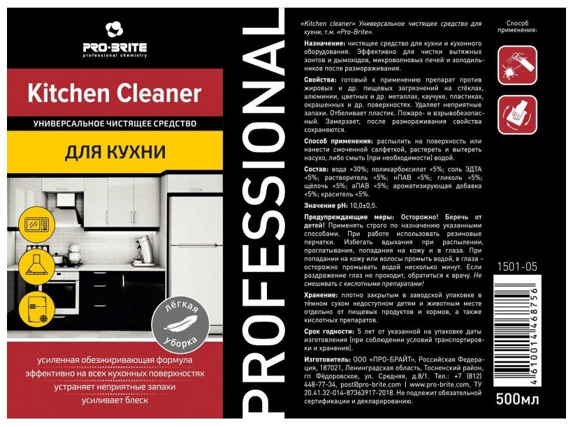 Назначение: чистящее средство для кухни и кухонного оборудования. Эффективно для чистки вытяжных зонтов и дымоходов, микроволновых печей и холодильников после размораживания Свойства: жидкий щелочной низкопенный готовый к применению препарат против жировых и др. пищевых загрязнений на стёклах, алюминии, цветных и др. металлах, каучуке, пластиках, окрашенных и др. поверхностях. Удаляет неприятные запахи. Отбеливает пластик. Биоразлагаемый. Пожаро- и взрывобезопасный. Замерзает, после размораживания свойства сохраняются.