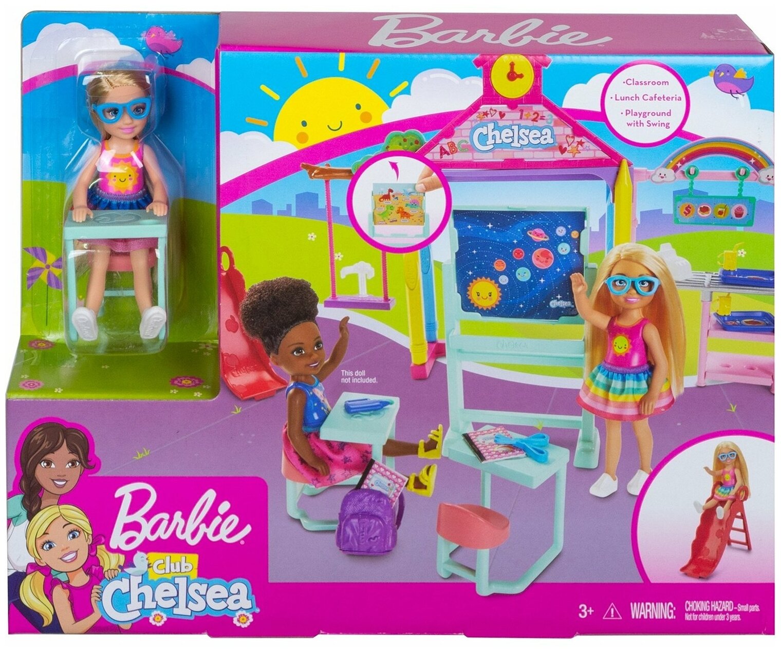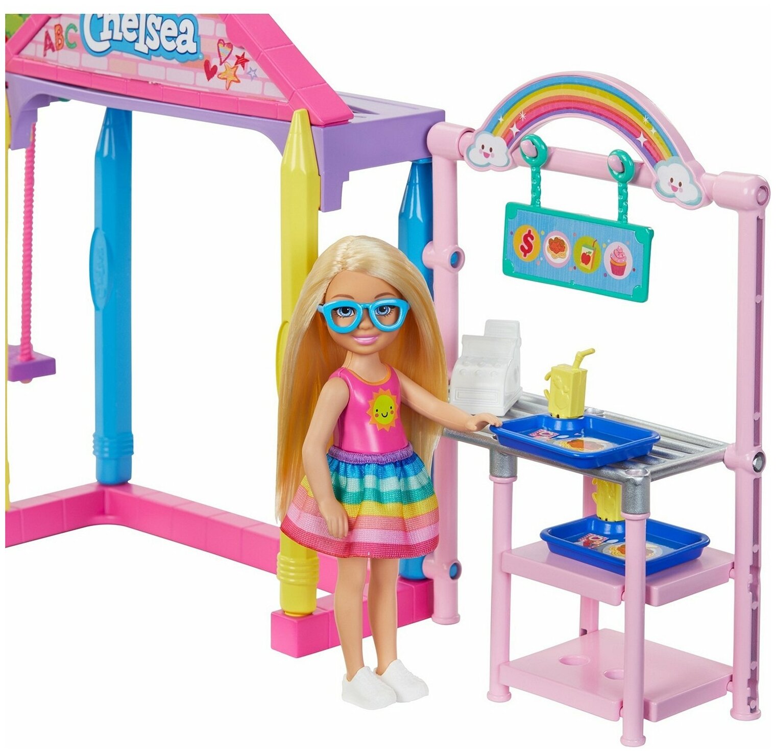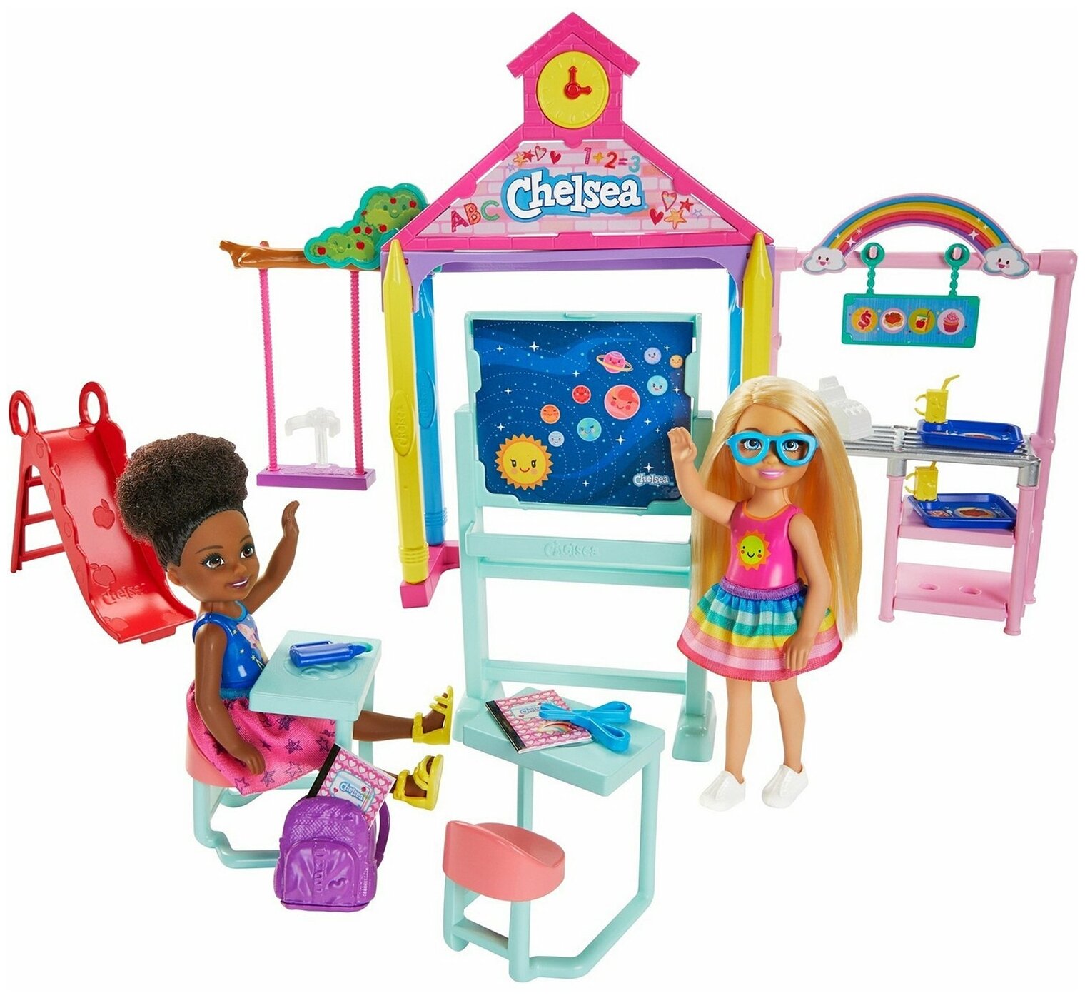 Кукла Челси вдохновляет малышей на исследование мира в веселой игровой форме, которую так любят дети! Этот игровой набор идеально подходит для малышей, которые хотят узнать больше о школе и познакомиться со школьными буднями! Мебель и разнообразные аксессуары помогут придумать множество веселых игр, провести увлекательные уроки и весело отдохнуть после занятий. Во время урока усадите Челси за парту, а на перемене покачайте ее на качелях или скатите с горки. Не забудьте заглянуть в кафетерий, чтобы перекусить!
