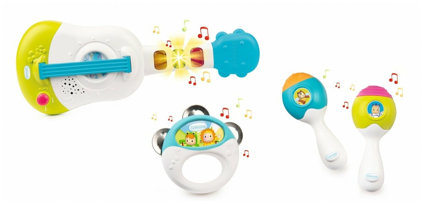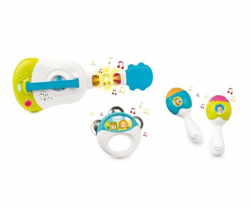 С музыкальным набором Cotoons малыши в игровой форме могут практиковаться в создании музыки. Набор состоит из укулеле, 2 маракасов и музыкальной тарелки, которые позволят малышу создать свой собственный темп.