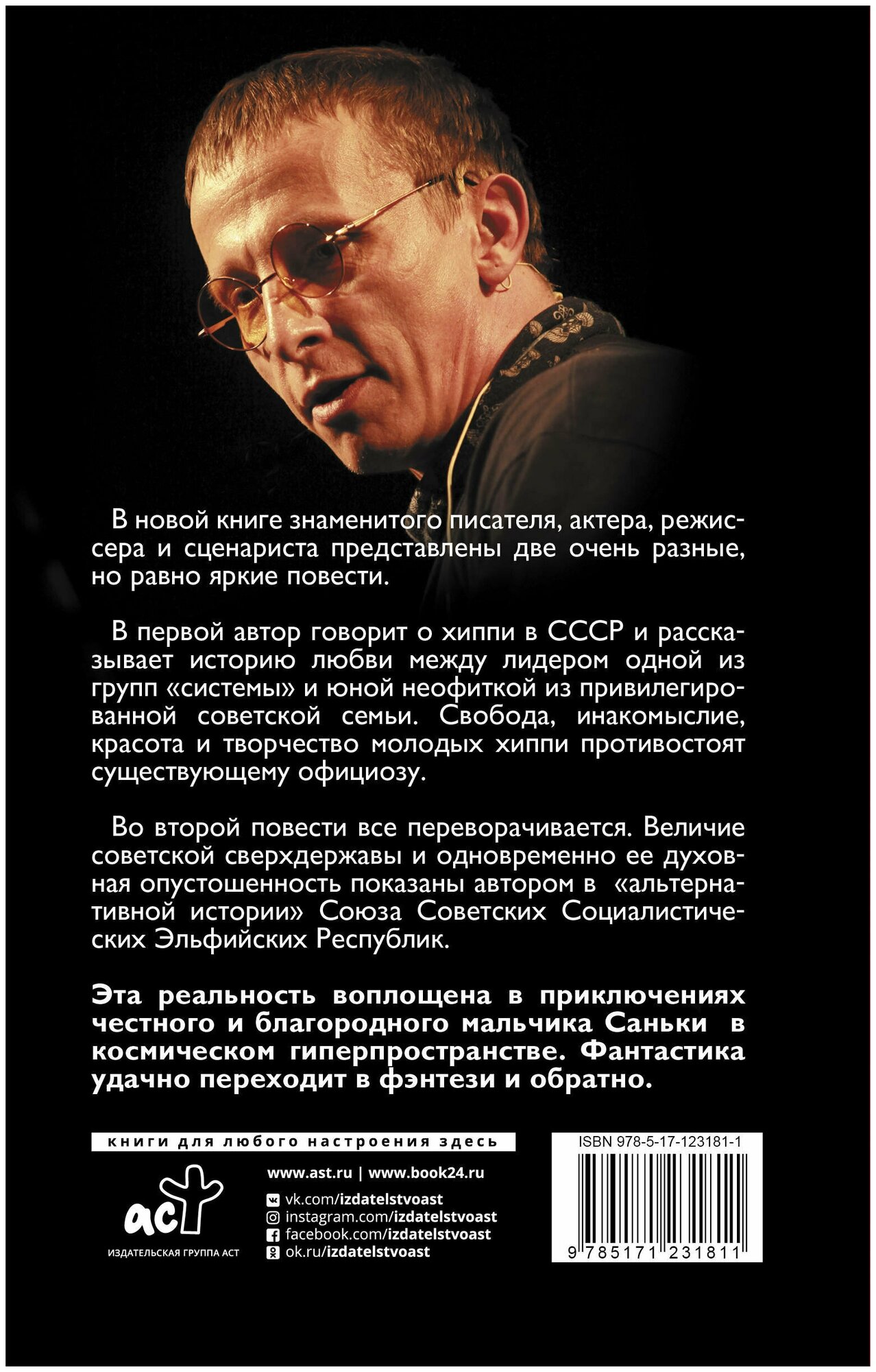 В новой книге знаменитого писателя, актера, режиссера и сценариста представлены две очень разные, но равно яркие повести. В первой автор говорит о хиппи в СССР и рассказывает историю любви между лидером одной из групп "системы" и юной неофиткой из привилегированной советской семьи. Свобода, инакомыслие, красота и творчество молодых хиппи противостоят существующему официозу. Во второй повести все переворачивается. Величие советской сверхдержавы и одновременно ее духовная опустошенность показаны автором в "альтернативной истории" Союза Советских Социалистических Эльфийских Республик. Эта реальность воплощена в приключениях честного и благородного мальчика Саньки в космическом гиперпространстве. Фантастика удачно переходит в фэнтези и обратно.