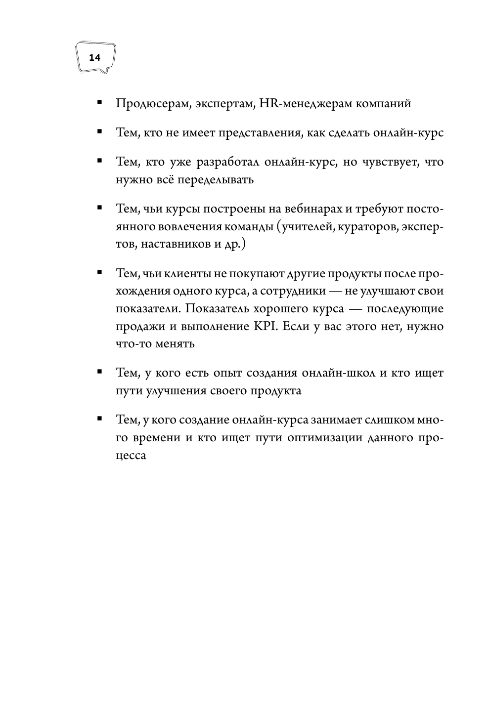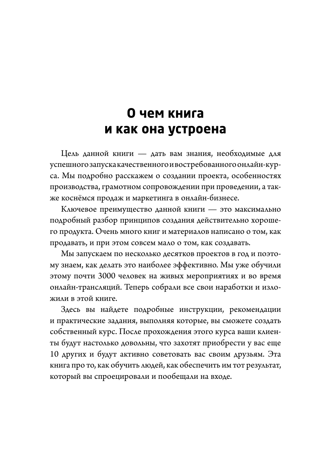 Книга полезна начинающим владельцам бизнеса онлайн-образования. Она даёт представление о структуре и этапах создания продукта.