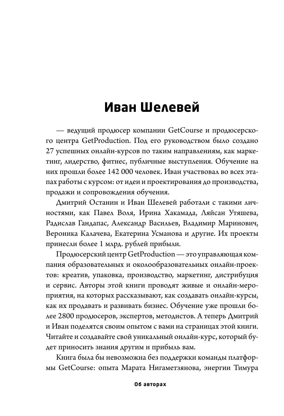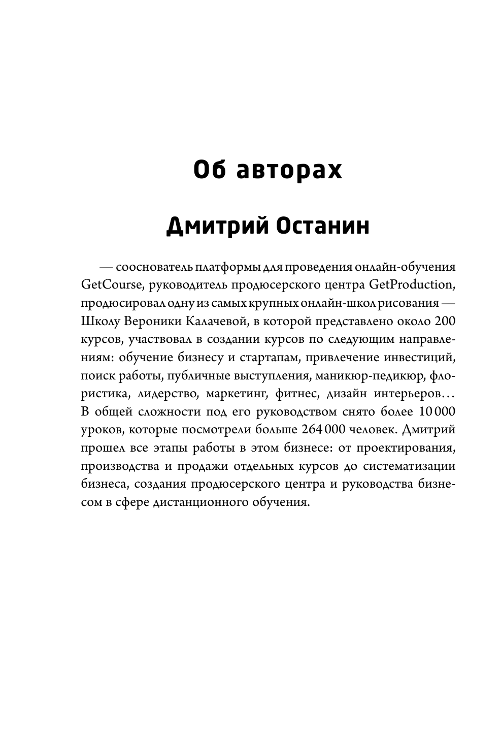 О том, как создать онлайн-курс "с нуля" - с пошаговой инструкцией, примерами, заданиями и полезными инструментами, которые помогут довести ваш новый продукт до совершенства. Книга прикладная и практическая: на примере реальных кейсов из своей практики авторы рассказывают, как создать действительно эффективный продукт. Среди самых ярких онлайн-проектов, которые запускали Дмитрий Останин и Иван Шелевей - онлайн-курсы и онлайн-марафоны для Ирины Хакамада, Павла Воли, Ляйсан Утяшевой, Радислава Гандапаса и многих других.
