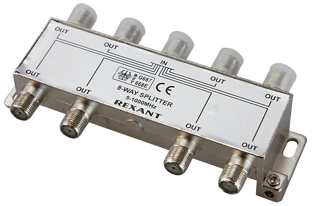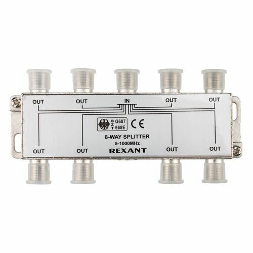 Телевизионный делитель/сплиттер с выходами под F-разъемы предназначен для разделения сигнала на 8 частей, актуален в многокомнатных квартирах. Полоса пропускания от 5 до 1000 МГц - для стандартного эфирного телевидения. Устройство обеспечит просмотр ТВ без помех с сохранением качества сигнала.