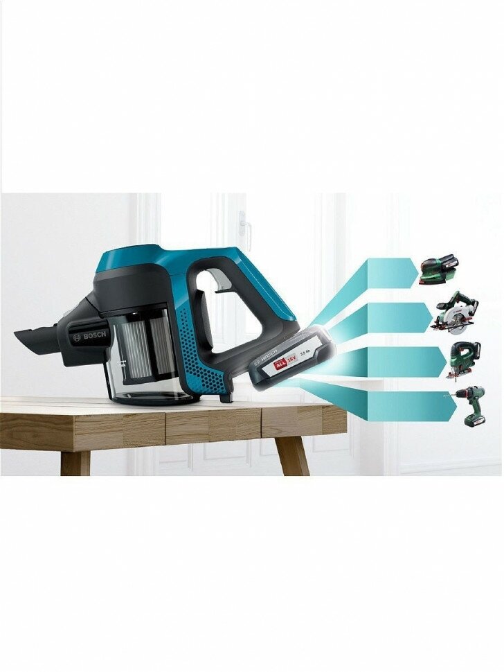 Самый компактный вертикальный пылесос в линейке Unlimited Bosch. Прибор выполнен в лазурно-голубом цвете. Сменный аккумулятор является частью системы Power for ALL и совместим с инструментами Bosch для дома и сада.