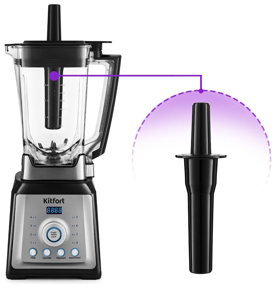 | Дополнительно * | Блендер Kitfort КТ-1399 с кнопочным управлением предназначен для приготовления пюре, взбивания, измельчения и смешивания. Он отлично справится с приготовлением смузи, молочных коктейлей, муссов, супов-пюре, соусов, детского питания, а также с колкой льда. Блендер оснащён вместительной чашей ёмкостью 2 л. В крышке есть специальное отверстие, закрываемое колпачком, для добавления ингредиентов непосредственно во время работы. 8 скоростных режимов позволяют выбрать оптимальный способ измельчения любого продукта. Также блендер имеет 4 режима работы: «Лёд», «Смузи», «Помол» и «Импульс». Надёжный двигатель мощностью 2000 Вт рассчитан на длительный срок эксплуатации. Блендер оснащён прочным и надёжным 8-лезвийным ножом из нержавеющей стали с оптимальной формой лезвий и заточки для эффективного равномерного измельчения продуктов. В комплекте с блендером идёт толкатель, который может понадобиться при измельчении твёрдых продуктов. У КТ-1399 есть усиленные прорезиненные ножки с большой площадью контакта с поверхностью. Это обеспечивает прочную фиксацию блендера на столе и дополнительно снижает вибрации, а также уровень шума при работе. |