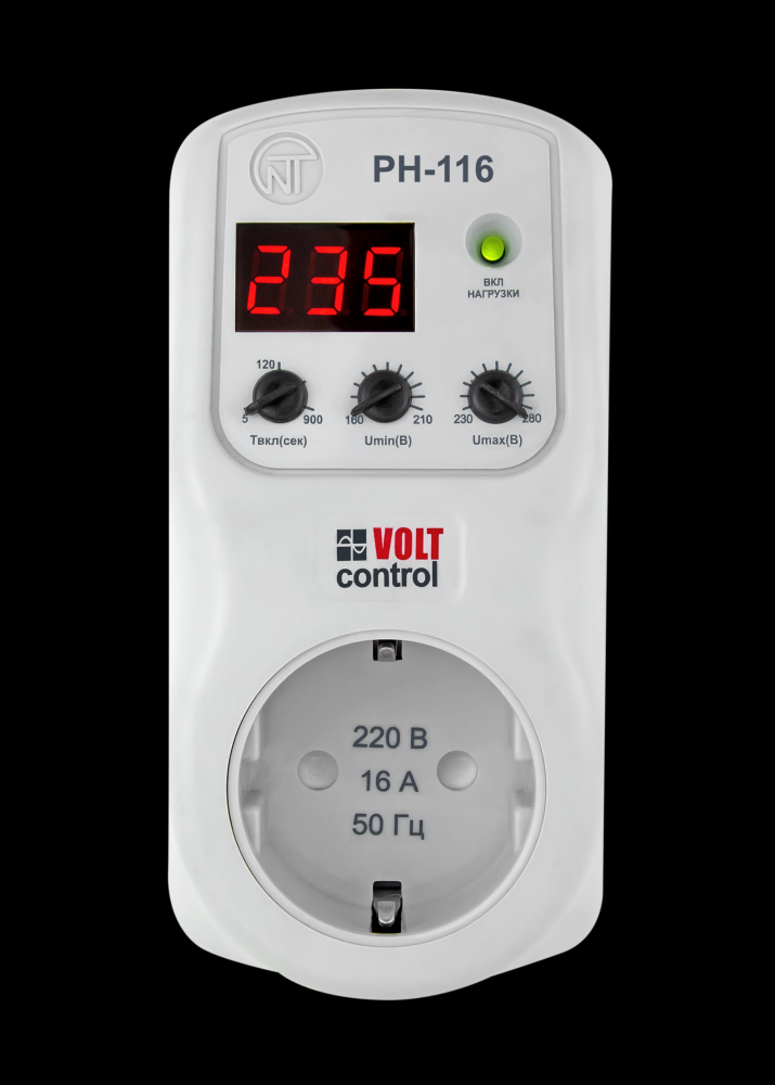 Реле напряжения РН-116 "Volt Control" предназначено для защиты бытовой техники (оборудования) мощностью до 3,5 кВт (холодильников, кондиционеров, стиральных машин, телеаудио техники и т.п.) от недопустимых колебаний напряжения в сети и последствий обрыва нейтрали.