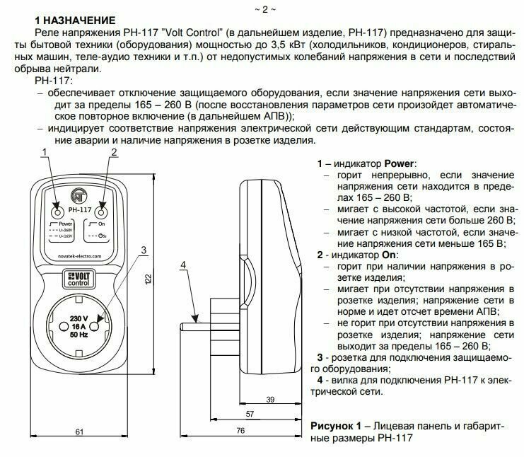 Реле напряжения РН-117 предназначено для защиты бытовой техники (оборудования) мощностью до 3,5 кВт (холодильников, кондиционеров, стиральных машин, теле-аудио техники и т.п.) от недопустимых колебаний напряжения в сети и последствий обрыва нейтрали.