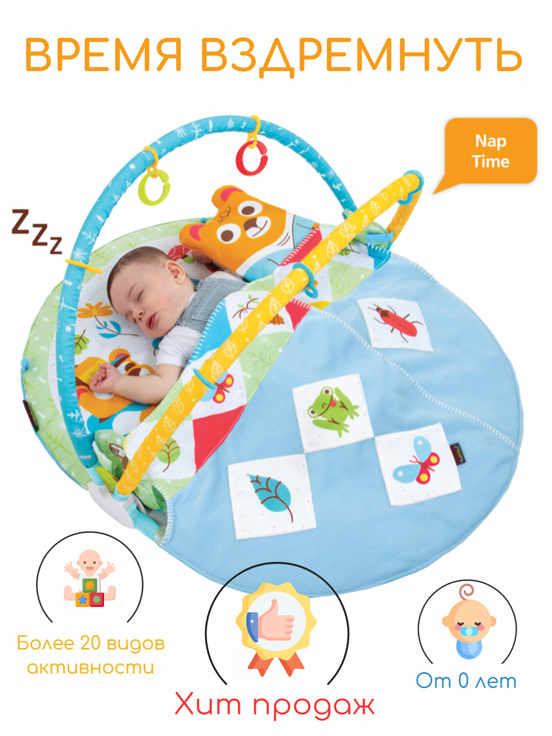 Инновационный развивающий коврик 2-в-1 "Играй и отдыхай" с безопасным и уютным конвертом-одеялом, которое легко закрепить к основанию, если Ваш малыш наигрался, устал и заснул.