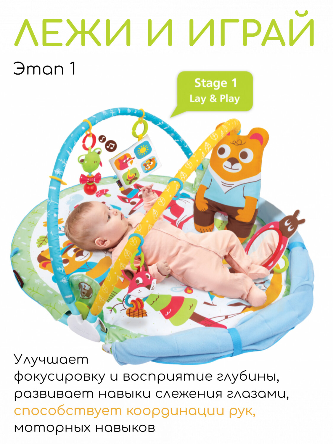 Этап 1: Лежи и играй - улучшает фокусировку и восприятие глубины, развивает навыки слежения за глазами и способствует координации глаз и рук, а также крупных моторных навыков.